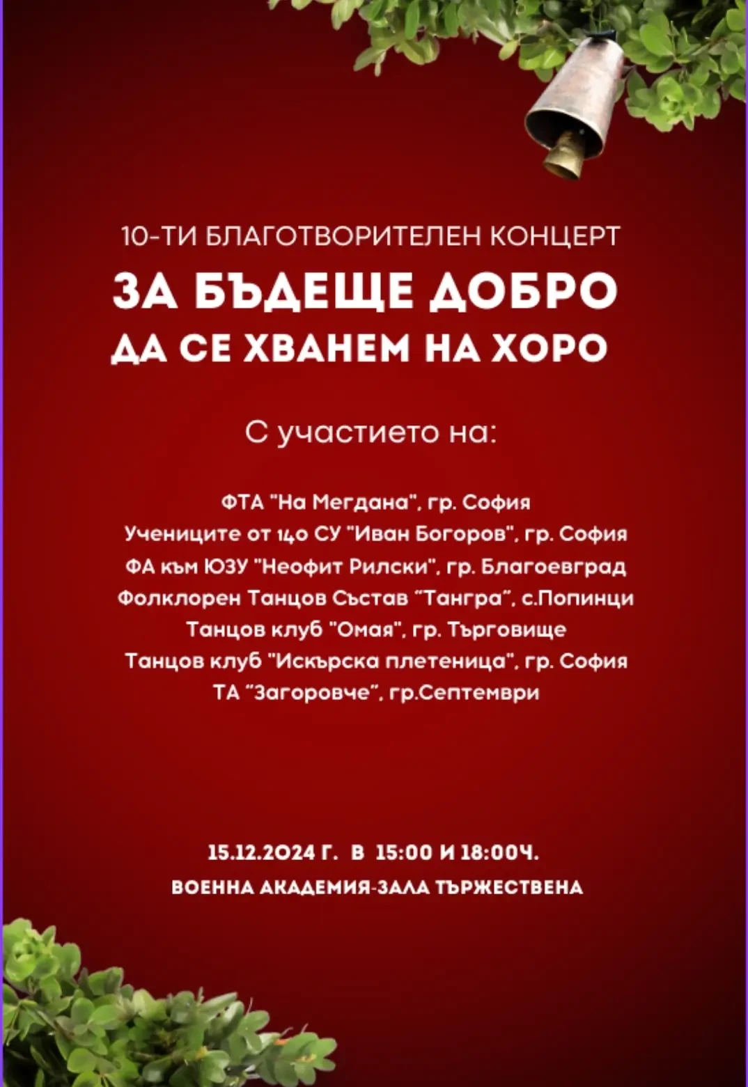 Сдружение "Клуб за хора и народни танци На Мегдана" и 140. СУ "Иван Богоров" имат удоволствието да ви поканят на Десети благотворителен концерт "За бъдеще добро да се хванем на хоро!", който ще се проведе на 15 Декември 2024г., Неделя, в две издания: