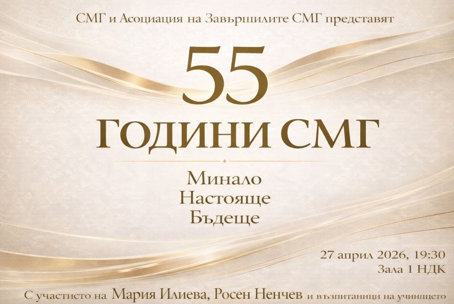 Заповядайте на 27 април 2026 г. от 19:30 ч. в Зала 1 на НДК, за да отбележим 55 години от създаването на Софийска математическа гимназия „Паисий Хилендарски“.