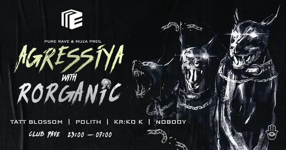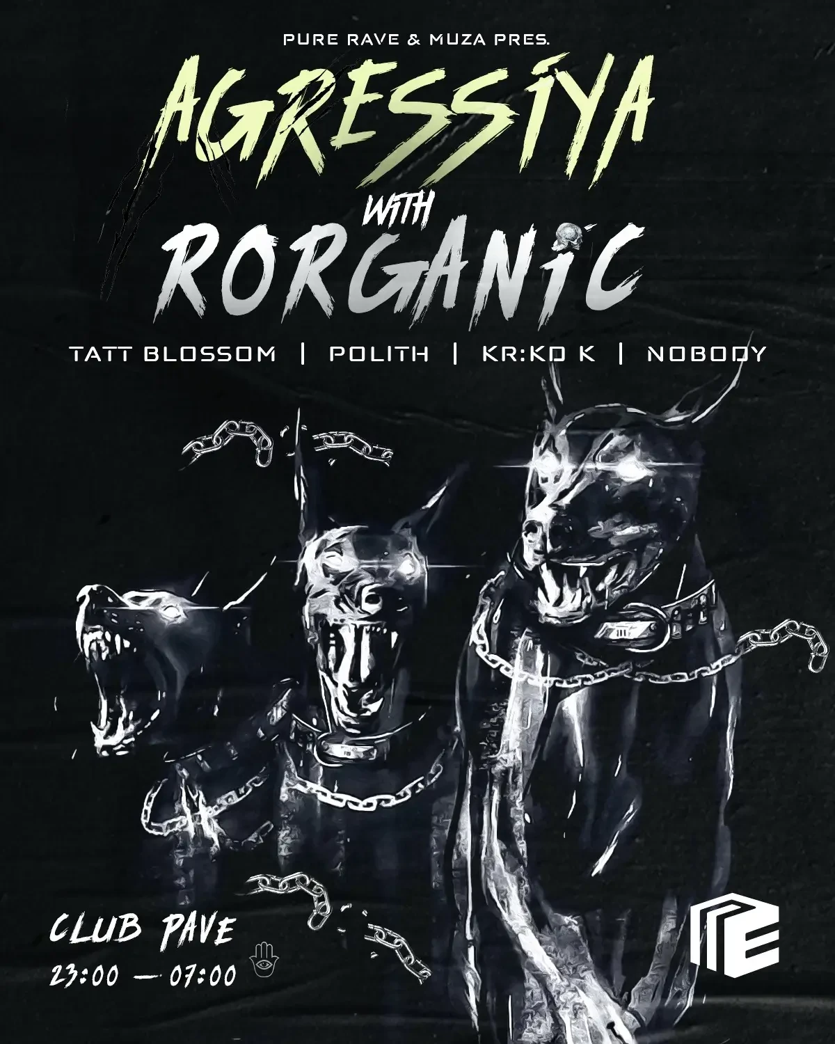 Създадохме нашата нова концепция AGRESSIYA, за да дадем възможност на яростта ви да излезе навън по най-добрия начин - танцувайки и слушайки агресивна музика - хард и индустриал техно. Каним ви да изследвате границите на ъндърграунд звученето и се стремим да ви накараме да се молите за още. Събирайки се в най-новия ъндърграунд клуб в София, за вашето добро настроение ще се погрижат изгряващите техно организации Pure Rave & Muza. Те заедно канят хедлайнера за вечерта - суровият, фънки и зловещ RORGANIC. Френският продуцент, диджей и съосновател на Obsession е един от най-влиятелните и иновативни артисти в индустриал техно сцена днес. Всеки любител на по-тежката техно музика е слушал поне един негов трак.