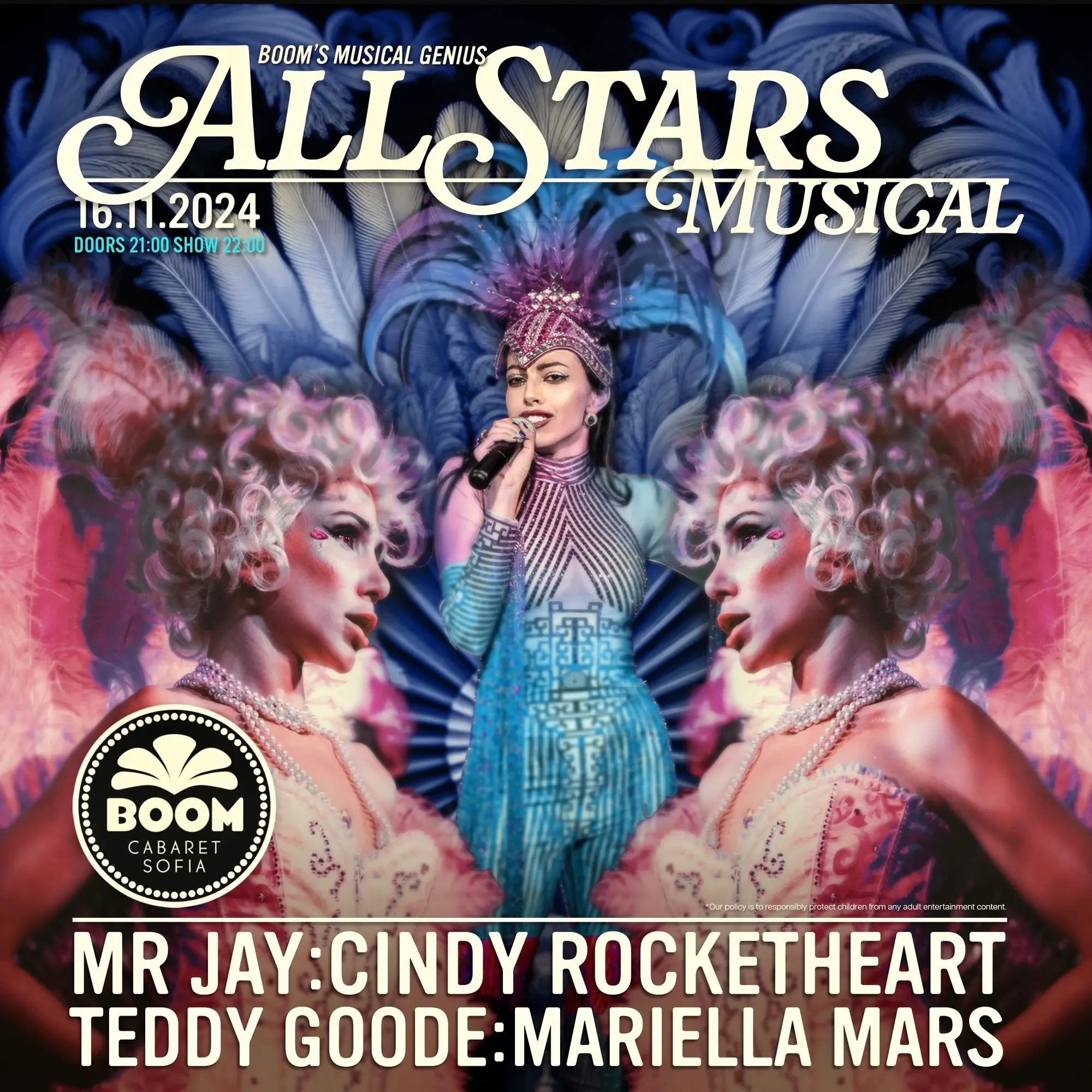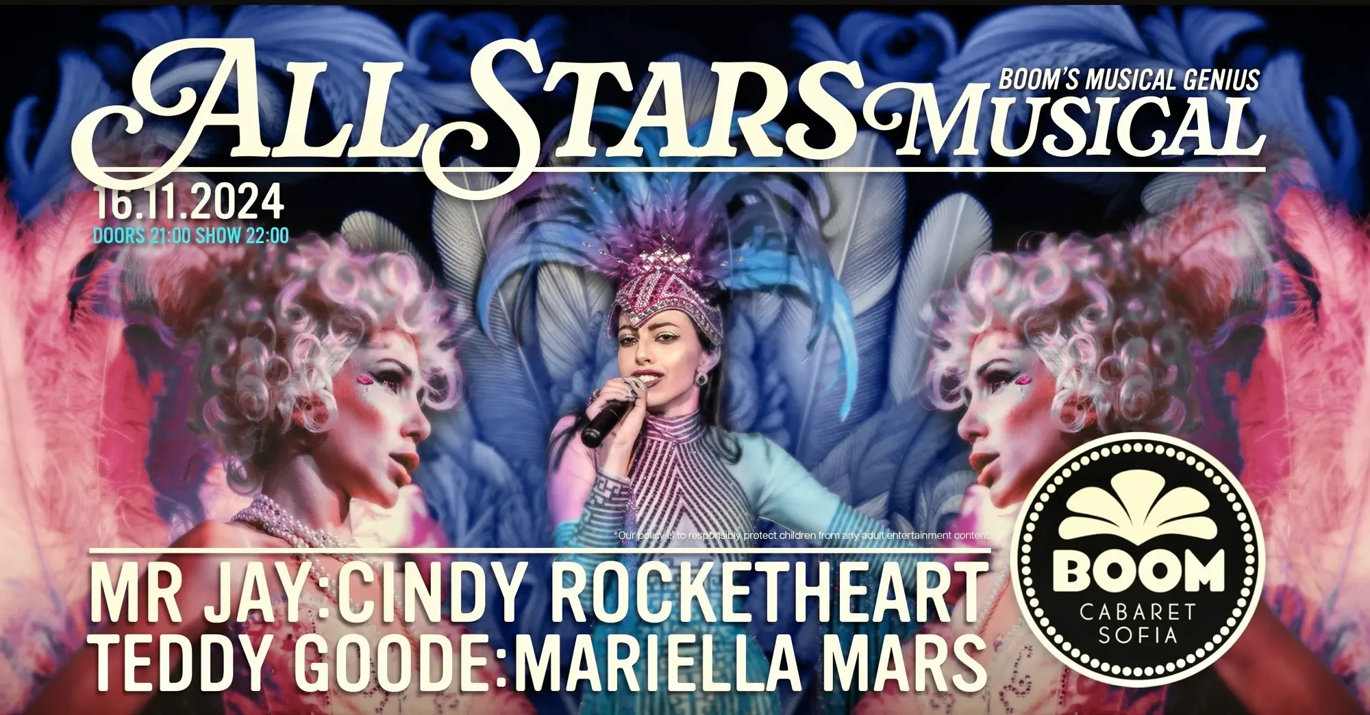 Невероятните гласове на Ася Андонова, Мариела Марс и Теди Гууд, заедно с нашите танцьори ще ви пренесат в бляскавия свят на кабарето!