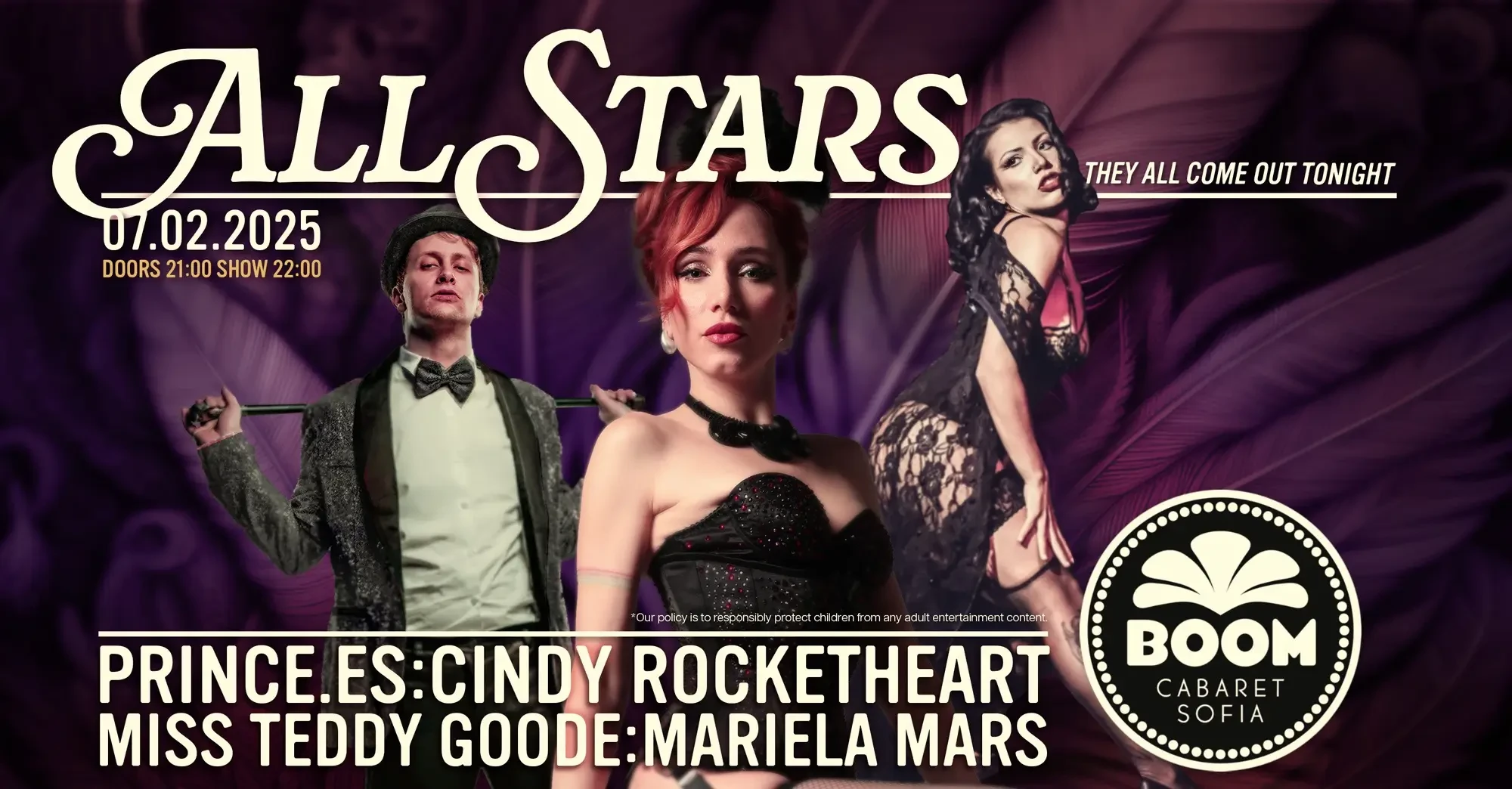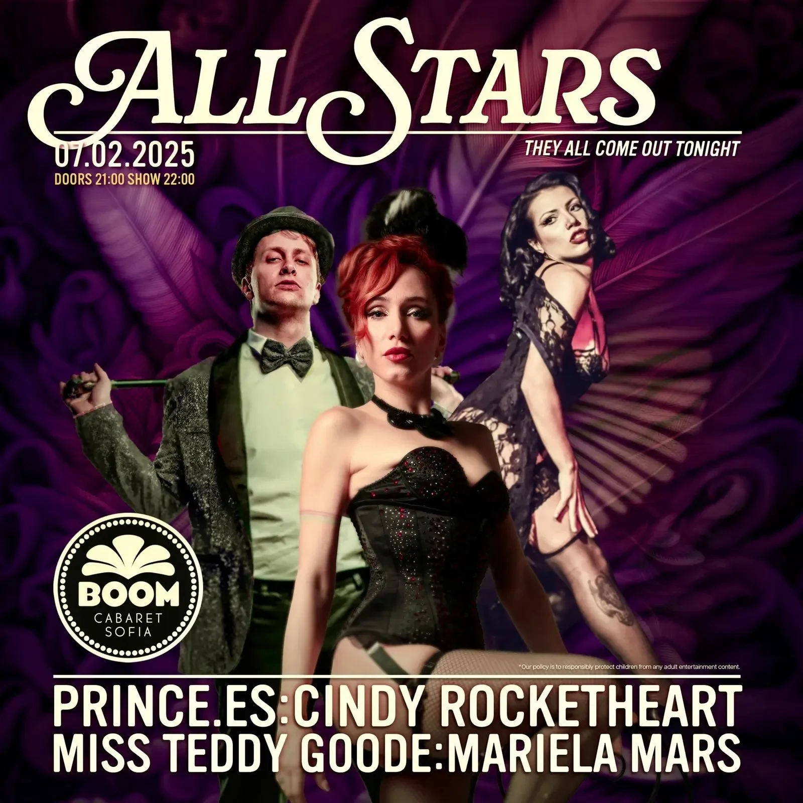 Ще гледате бляскави бурлеск изпълнения с танцьори, както комедия и много песни, изпълнени от нашите невероятни певици и бурлеск диви, в едно мащабно шоу! Заповядайте в единствения кабаре театър у нас и нека заедно потънем в света на бурлеска и кабарето! Звездите на кабарето ви очакват за една незабравима вечер!