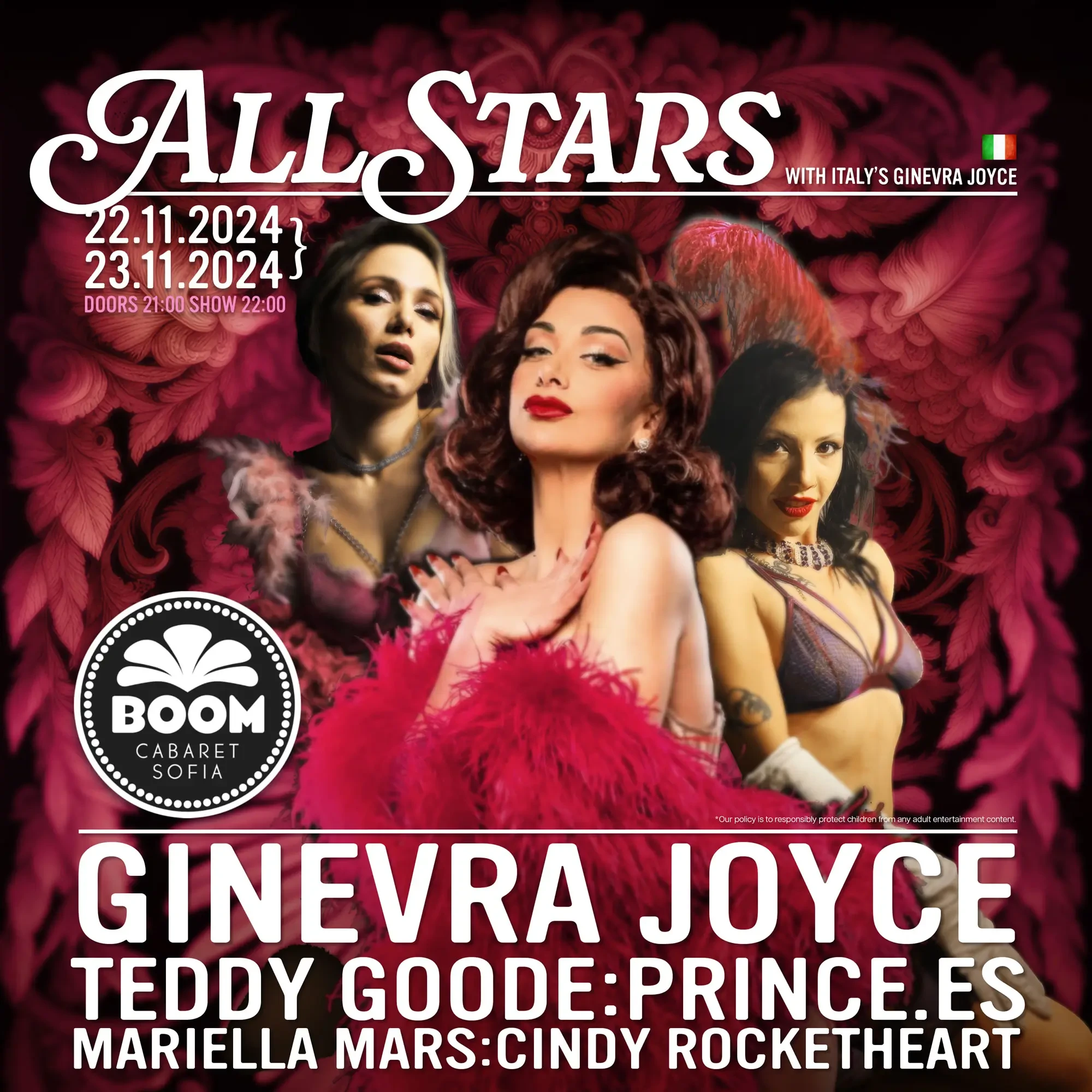 Заедно с дивата на световната сцена Ginevra Joyce, ще изгреят и звездите на “Буум Кабаре”! *Поради големия интерес шоуто е в две поредни вечери, като местата са ограничени!