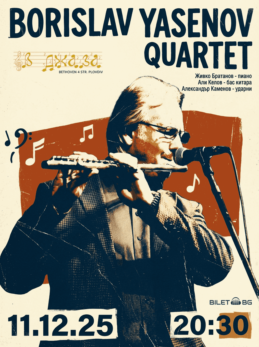 Тази седмица в В Джаза се събираме за една от онези вечери, в които музиката просто те издърпва вътре. Борислав Ясенов идва със своя квартет – флейтата му е като отделен персонаж, а около него се завъртат: