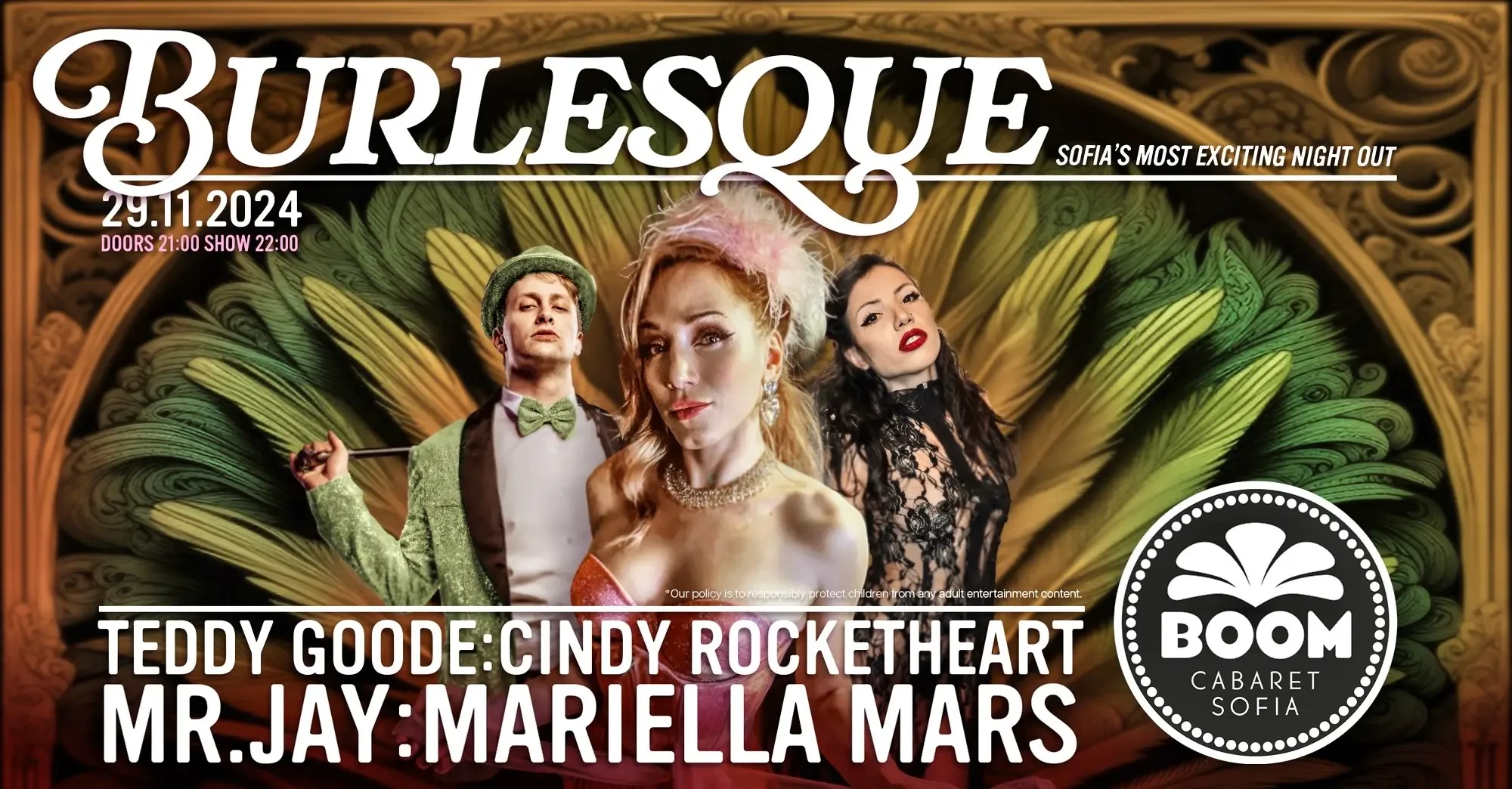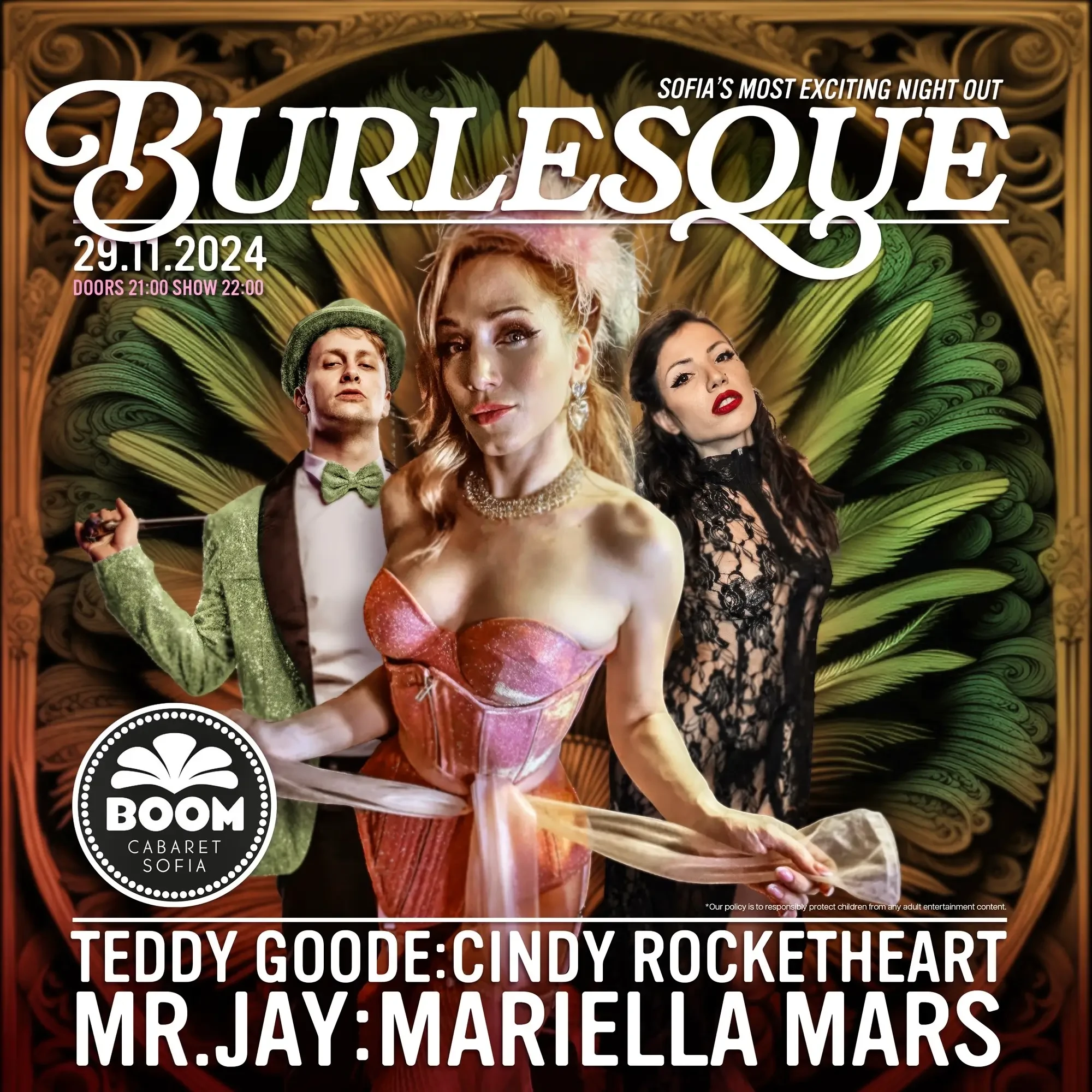 “Буум Кабаре” ви кани на шоу от блясък, песни на живо, комедия и доза еротика! Единственото бурлеск кабаре у нас ви готви една забавна вечер, изпълнена с впечатляващи хореографии, костюми и зрелищни изпълнения в бутиковата атмосфера на нашия ретро кабаре театър.