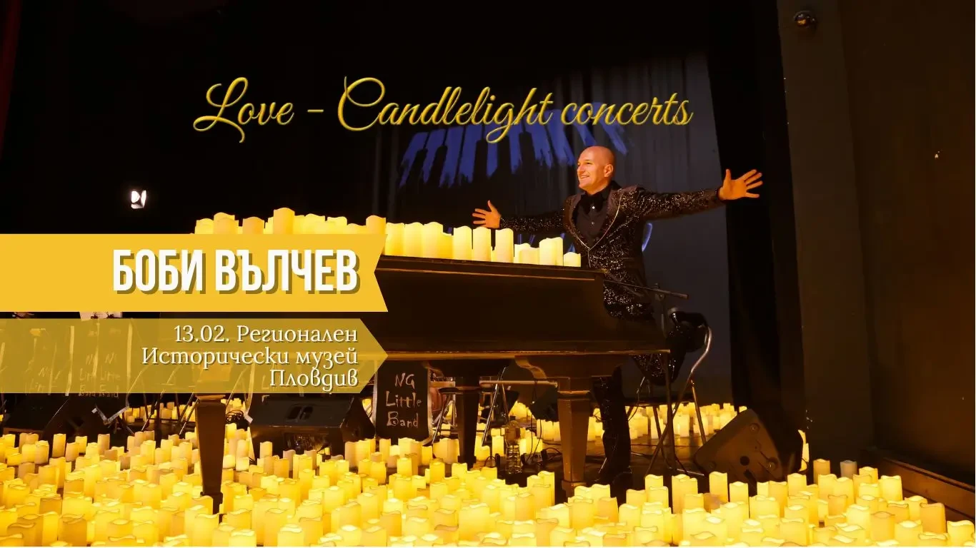 Вземете билетите си днес и се потопете в магията на Candlelight Concert – LOVE от Боби Вълчев в Исторически музей Пловдив! Боби Вълчев ще ви посрещне в 18.30 с welcome drink във фоайето на Регионален исторически музей Пловдив, а концерта започва в 19:00 часа