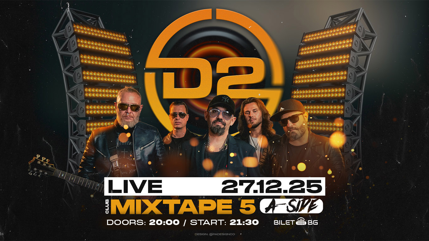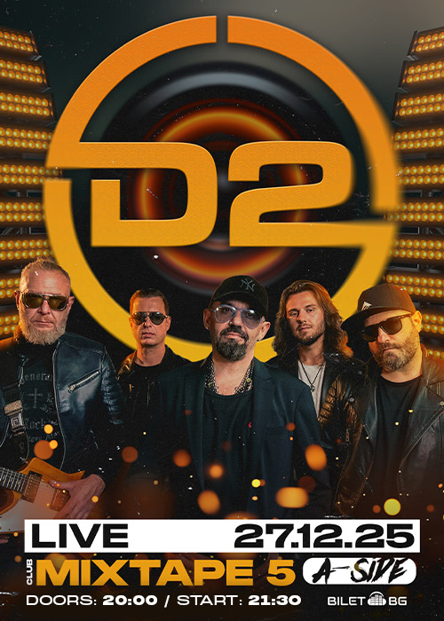 Изминалата година беше изключително силна за групата, която в края на септември издаде "Преди да кажеш не" - първия си сингъл от близо двайсет години с оригиналния фронтмен Дичо Христов, и изнесе десетки концерти в цялата страна. В разгара на Коледно-новогодишните празници D2 ще зарадва феновете с юбилейна двойна концертна плоча, и CD "25 години D2", които ще могат да бъдат закупени на място. Очаква ни гореща вечер с всички хитове на групата и специалното участие на Деян Славчев - Део. Очакваме ви!