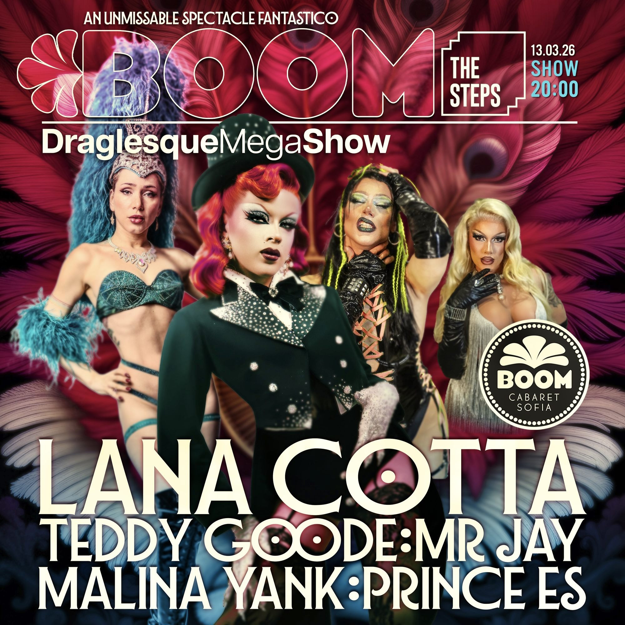 Една от най- бързо развиващите се драг звезди на Париж ще застане рамо до рамо на сцената с Малина Янк , Принцес, Теди Гууд и танцьорите на “Буум Кабаре” в едно представление на световно ниво!