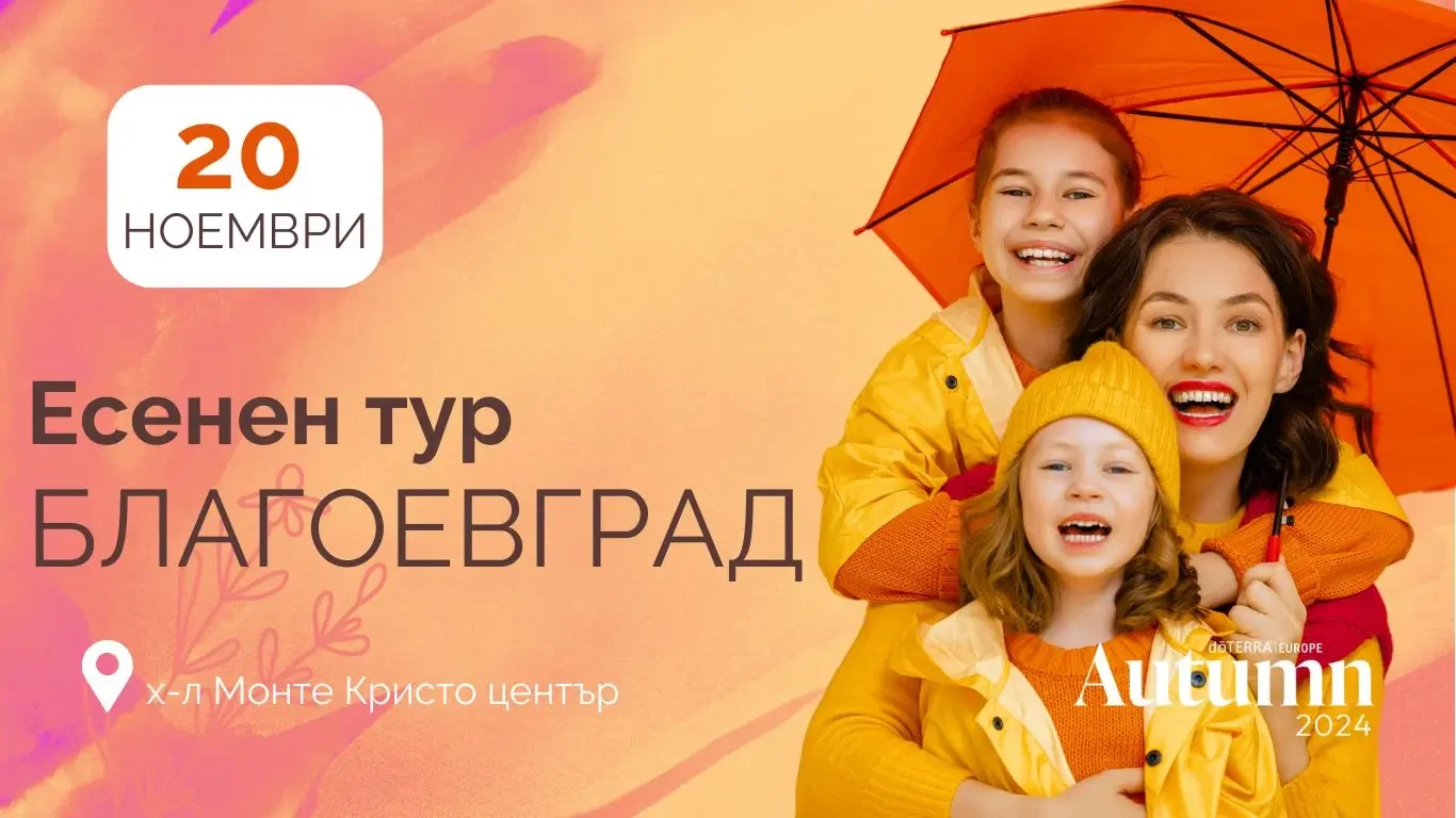 Добре дошли на нашия есенен тур в Благоевград. Събитието ще се проведе в х- л Монте Кристофър от 18:00 часа до 20:30 часа. Побързайте да си вземете билети, за да сте сигурни, че имате запазено място. Всеки, който си е закупил билет, е добре да бъде 15 мин преди събието, за да намери своето място,да опита от нашите продукти и да получи своите подаръци. С всеки билет получавате бутилка минерална вода + Сибирска ела 15мл при закупуване на стандартен билет и 5 мл Портокал при закупуване на икономичен билет. Поканете приятелите си, защото ще бъде интересно, вълнуващо и с много подаръци! Останете докрай, за да опитате късмета си в нашата томбола с много подаръци!