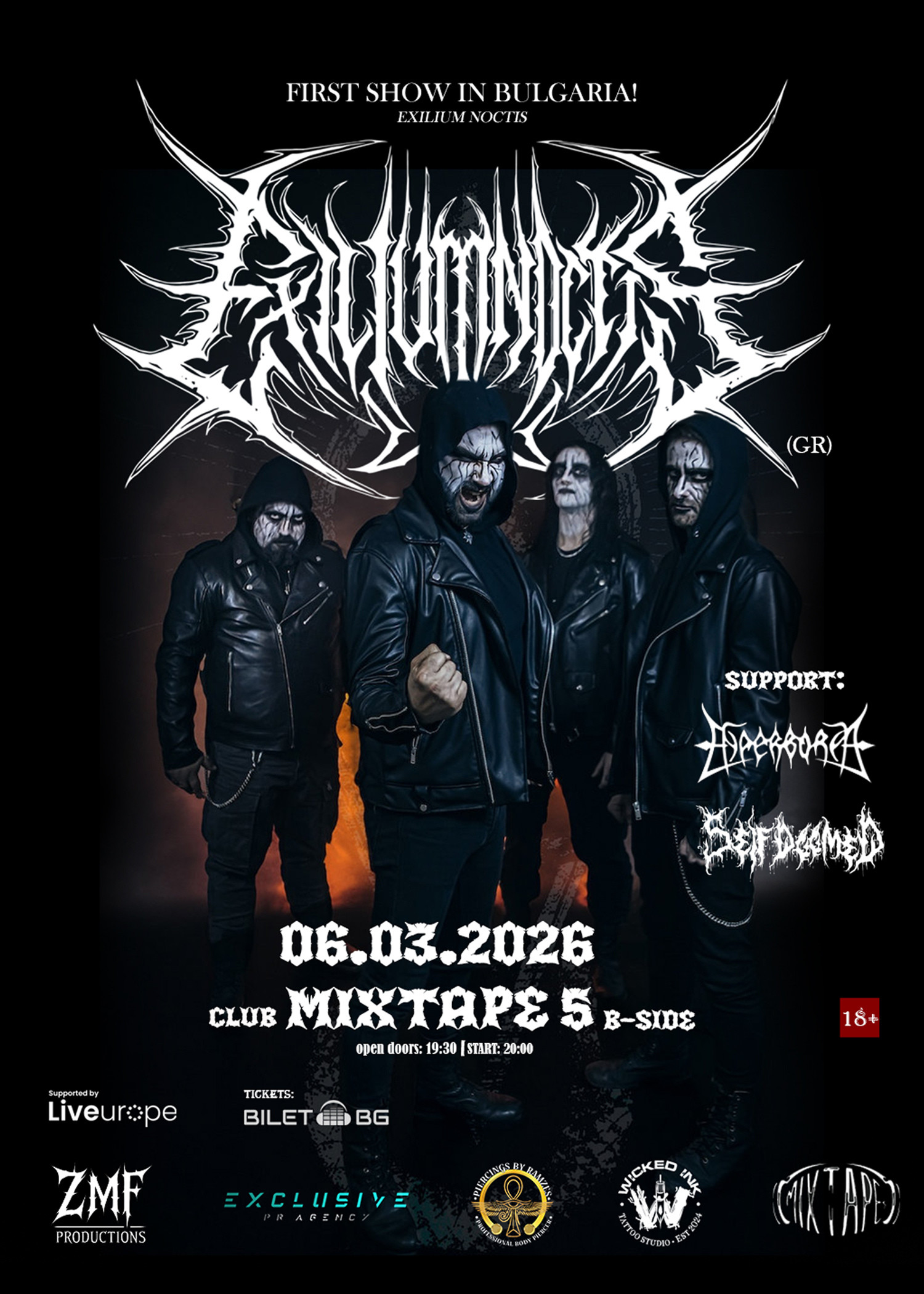 Гръцката blackened death метъл стихия Exilium Noctis идва за първи път в България! Пригответе се за концерт, изпълнен с бруталност, ритуална атмосфера и тотална звукова разруха.