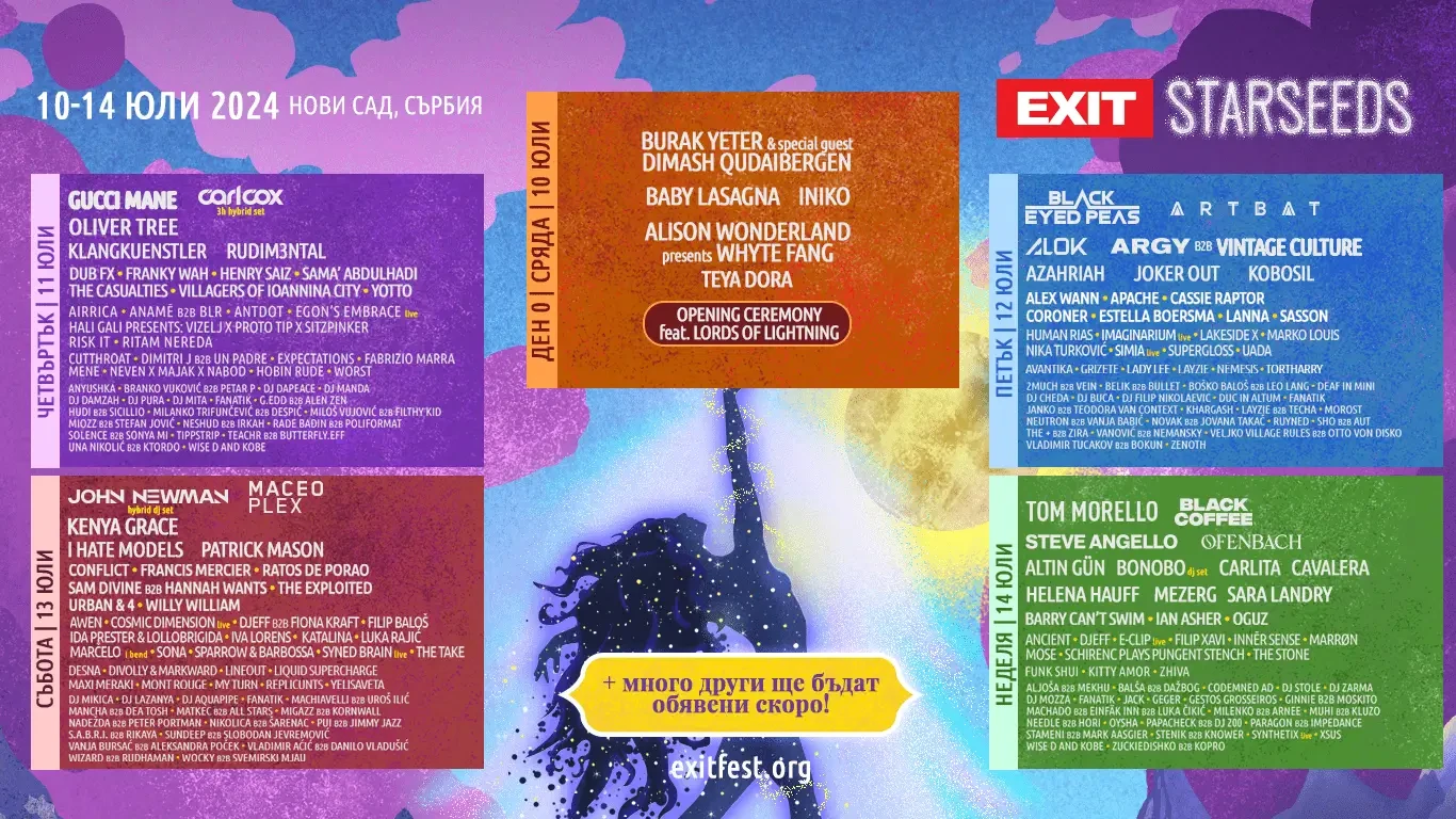 EXIT е всепризнат летен музикален фестивал, който се провежда всяка година в Петроварадинската крепост, исторически паметник в Нови Сад, Сърбия, с изглед към река Дунав. С повече от 1000 артисти, които свирят на над 40 сцени и фестивални зони, EXIT е един от най-еклектичните, водещи музикални фестивали в региона. През своите 23 години съществуване EXIT се превърна в дом за мнозина, който те продължават да посещават, обичат и подхранват всяка година.