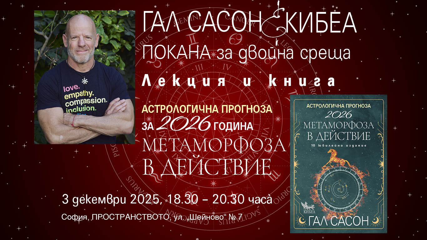 От 18.30 часá Гал Сасон ще представи традиционната си обзорна лекция за следващата година, съчетавайки умело мъдростта на звездите, кабала, нумерология, история и митология. Специално за първата му предколедна среща с кибейските ПОчитатели ще излезе от печат и книгата „АСТРОЛОГИЯ 2026. Метаморфоза в действие“.