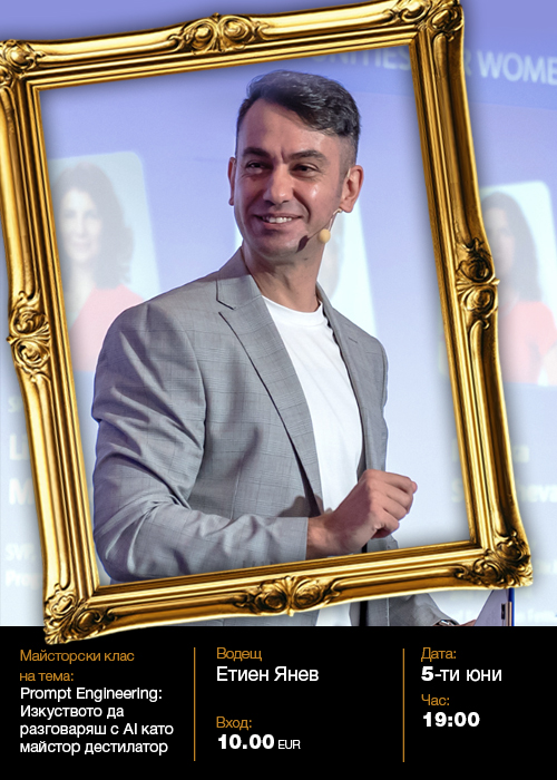 Етиен Янев е консултант и лектор в сферата на изкуствен интелект, дигитален маркетинг и личен брандинг. Създател на най-голямата AI общност в България и съосновател на Sofia Marketing Meetups. Автор на книгата „Компас за дигитален маркетинг" и преподавател в SoftUni Digital и НБУ. Провежда корпоративни AI обучения за организации в България и чужбина. През 2025 г. е отличен в класацията Top 100 таланта на България в категория „Консултант" от Career Show Index.
