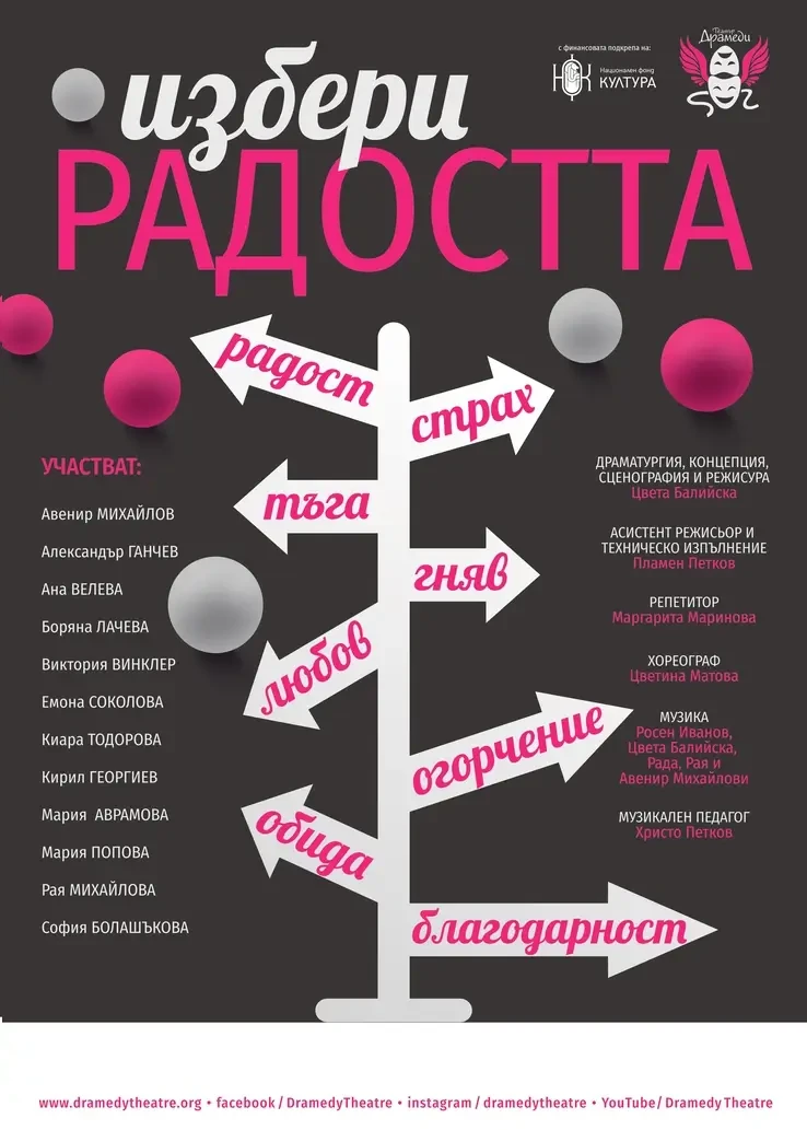Създаден на синергичен принцип, заедно с всички участници – един синтетичен авторски спектакъл, който ни напомня, че радостта е избор и че ние сме авторите на живота си.
