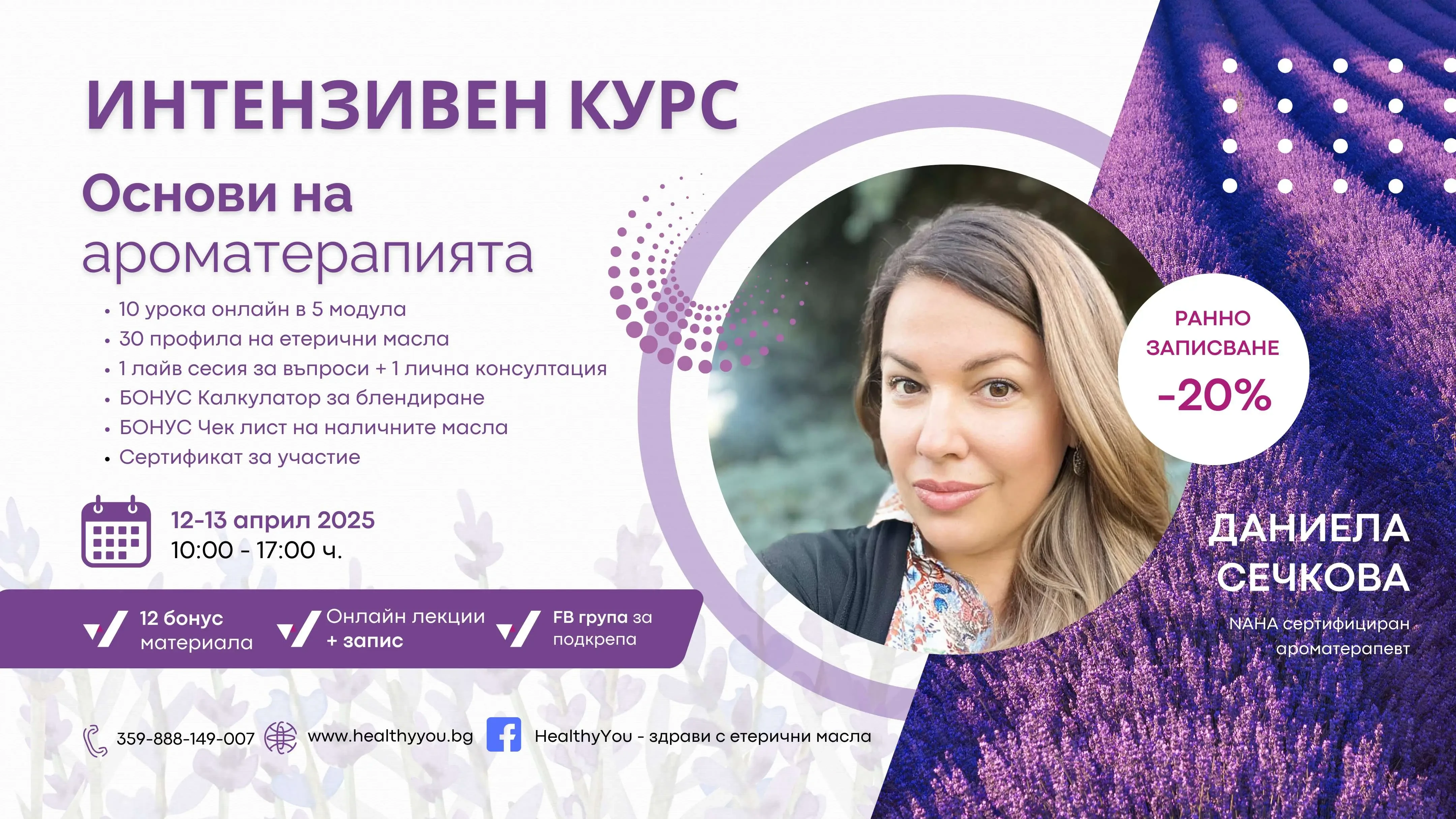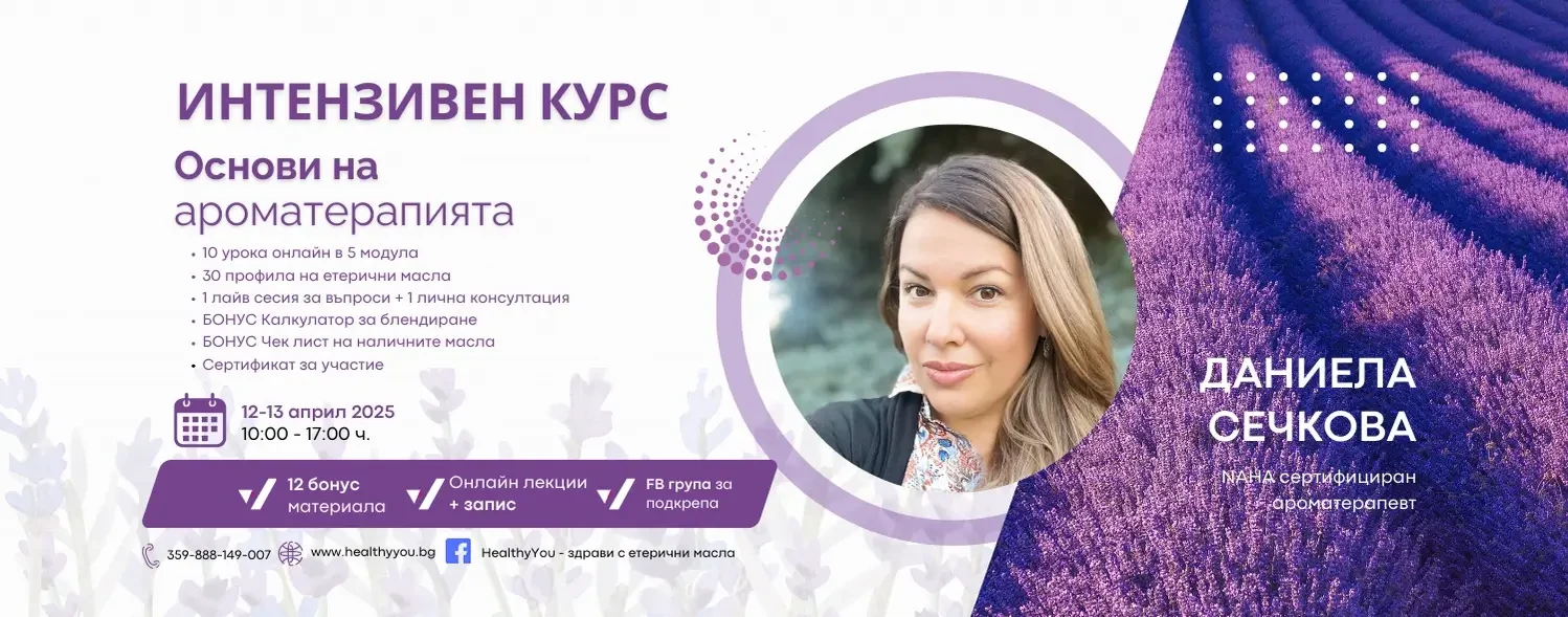 ПРОГРАМА на курса и всички детайли, вижте тук: https://www.healthyyou.bg/courses/aromatherapy-for-beginners/