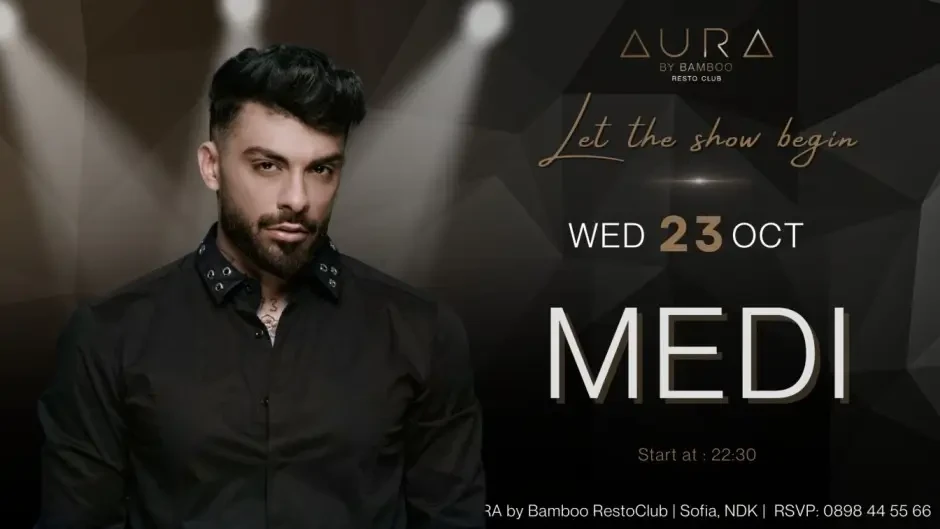 Посрещаме Меди на сцената на Aura by Bamboo RestoClub на 23.10. Уверете се, че ще станете част от тази епична вечер с много настроение и хитове.