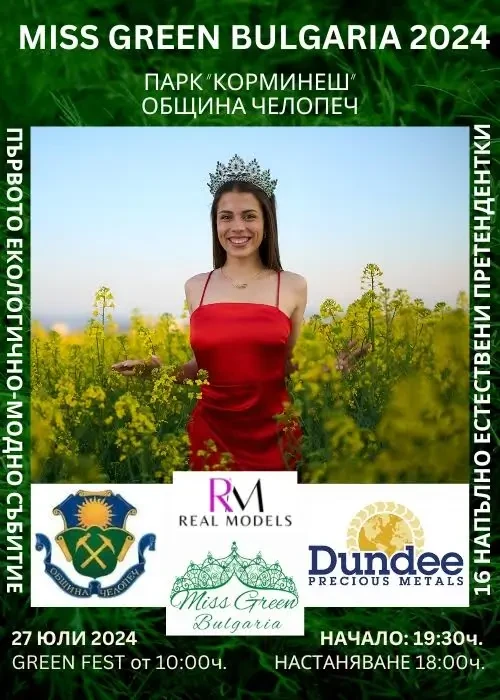 Присъединете се към най-значимото екологично-модно събитие на годината - Miss Green Bulgaria 2024! На 27 юли 2024 г., в парк Корминеш, Община Челопеч, ще се проведе уникален конкурс, съчетаващ красота, мода и екология.