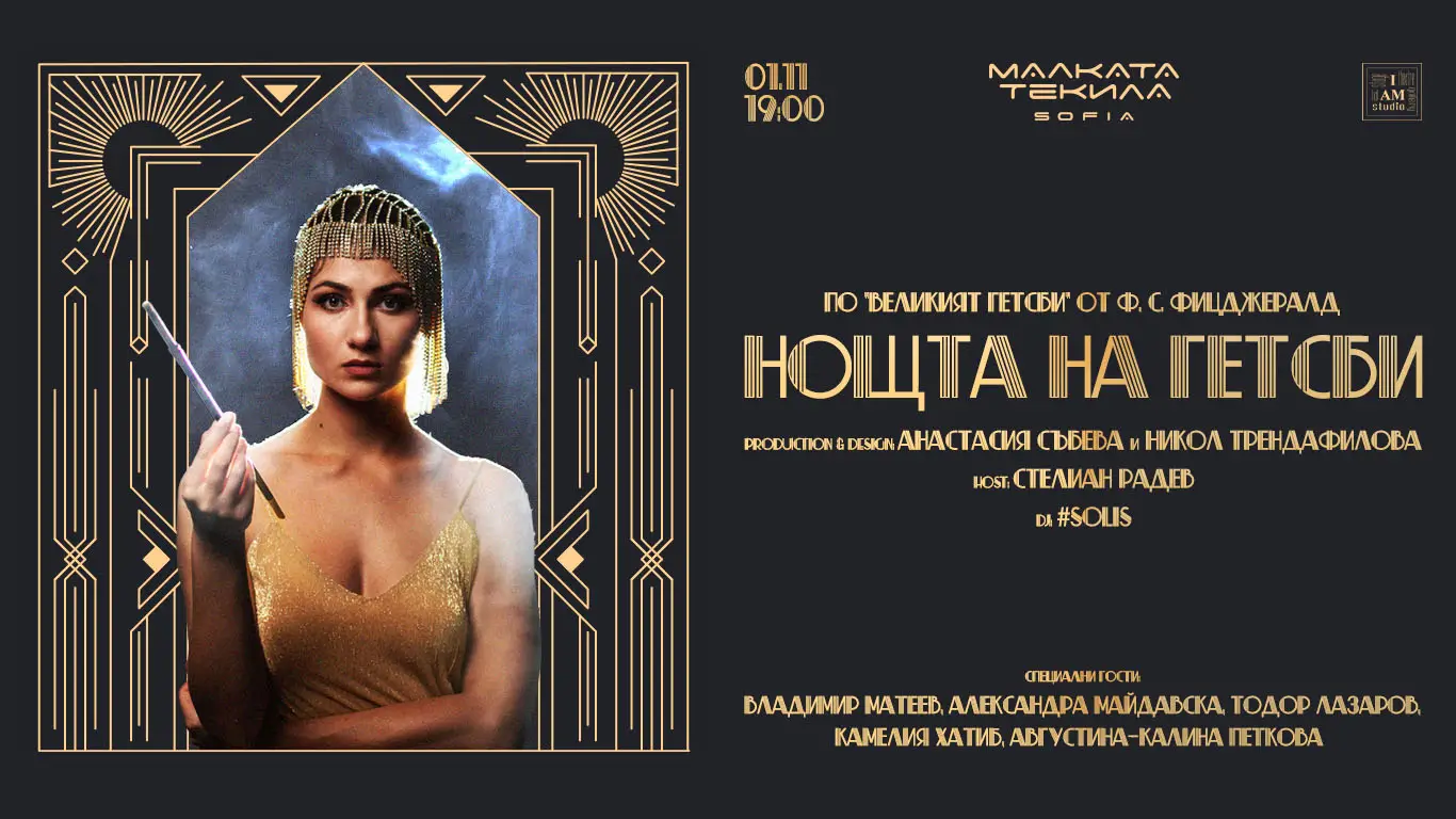 Казват, че Гетсби още е жив. Казват, че всяка нощ чака своите гости. Някои вечери музиката заглъхва, но шепотът остава. В нощта на 1 ноември Малката Текила София отваря врата към друг свят и вие ще бъдете част от него. Едновременно зрители и участници. Никой не знае какво ще се случи. Облечете се за парти. Но бъдете готови и за нещо повече. Това е нощ, в която вие ставате част от историята на Гетсби. Не просто парти, не просто театър.