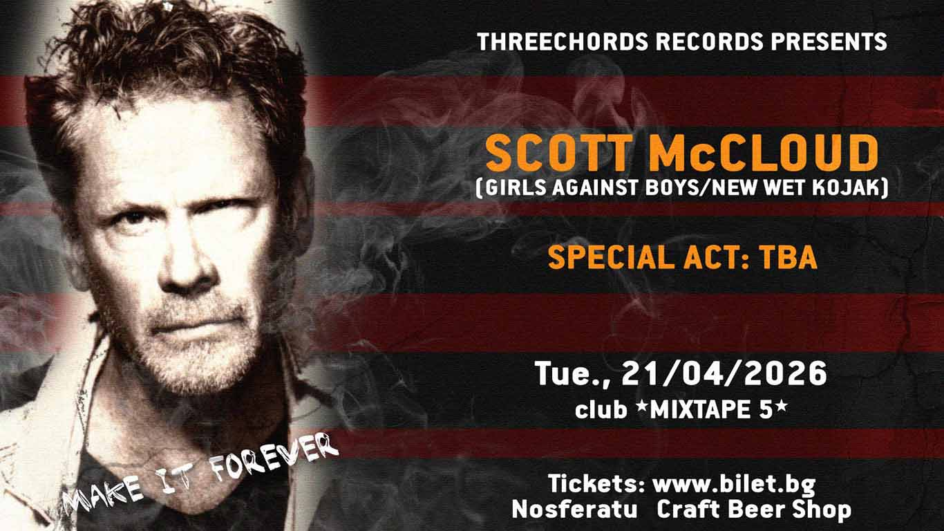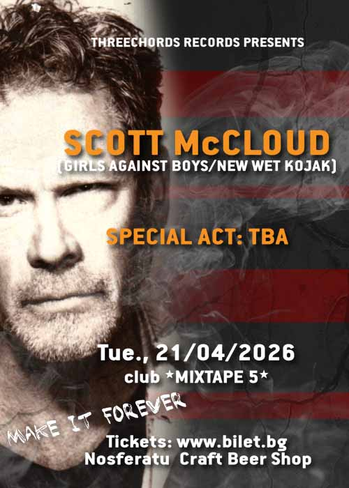 На 21 април 2026 г., вторник, Scott McCloud ще се качи сам на сцената на столичния клуб *Микстейп 5* за да се изправи срещу героите от песните на Girls Against Boys, размишлявайки върху живота, наслаждавайки се на спомените, но без да затъва в бездната на миналото. Хипнотизиращите му вокали обединят всички провокативни, минималистични образи в един солов проект, който отвежда носталгията на ново ниво, разкрива я пред публиката и я прави още по-уязвима, защото албумът „Make It To Forever“ звучи повече като акустичен албум на Girls Against Boys, към който ще се връщаме отново и отново, търсейки спокойствие и утеха в един смислен разговор със стар приятел.