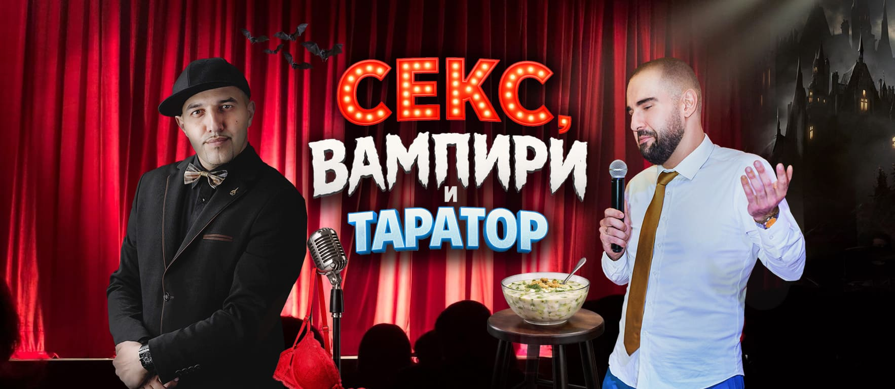 В шоуто им "Секс, вампири и таратор" двамата ще ви поговорят за нещата от ежедневието, за шоубизнес, за конспирации, за балкански страсти, за вампири, за кисело мляко, и разбира се – за още нещо.
