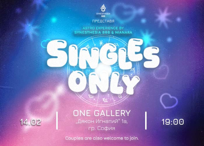 Singles Only е астрологично социално събитие за хора, които искат да се запознават, общуват и разширят кръга си, в спокойна и добре водена среда.