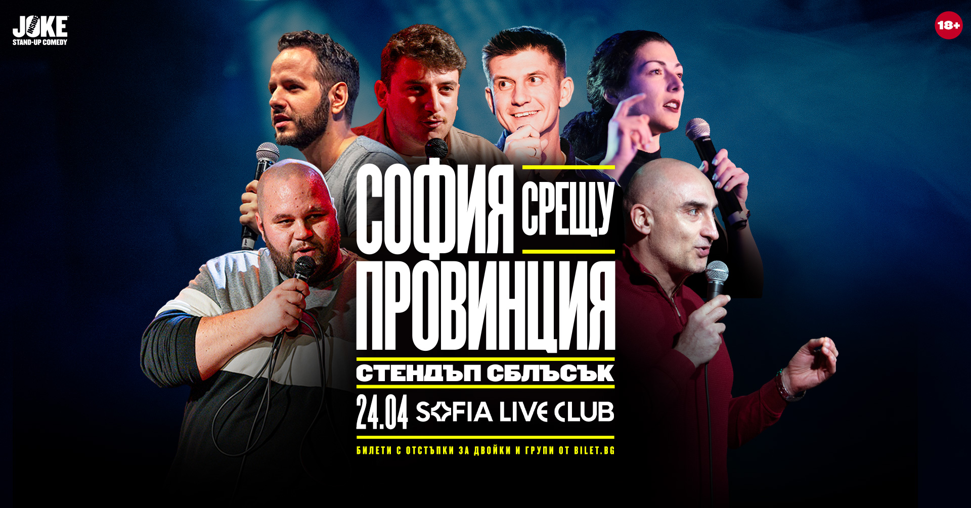 Шест комедианти, тарани в стендъп комедията, от столицата и дълбоката провинция, ще премерят шеги и пънчове на сцената на SOFIA LIVE CLUB! Не пропускайте едно несравнимо шоу, от което ще направите коремни преси от смях - не зависимо от къде сте.