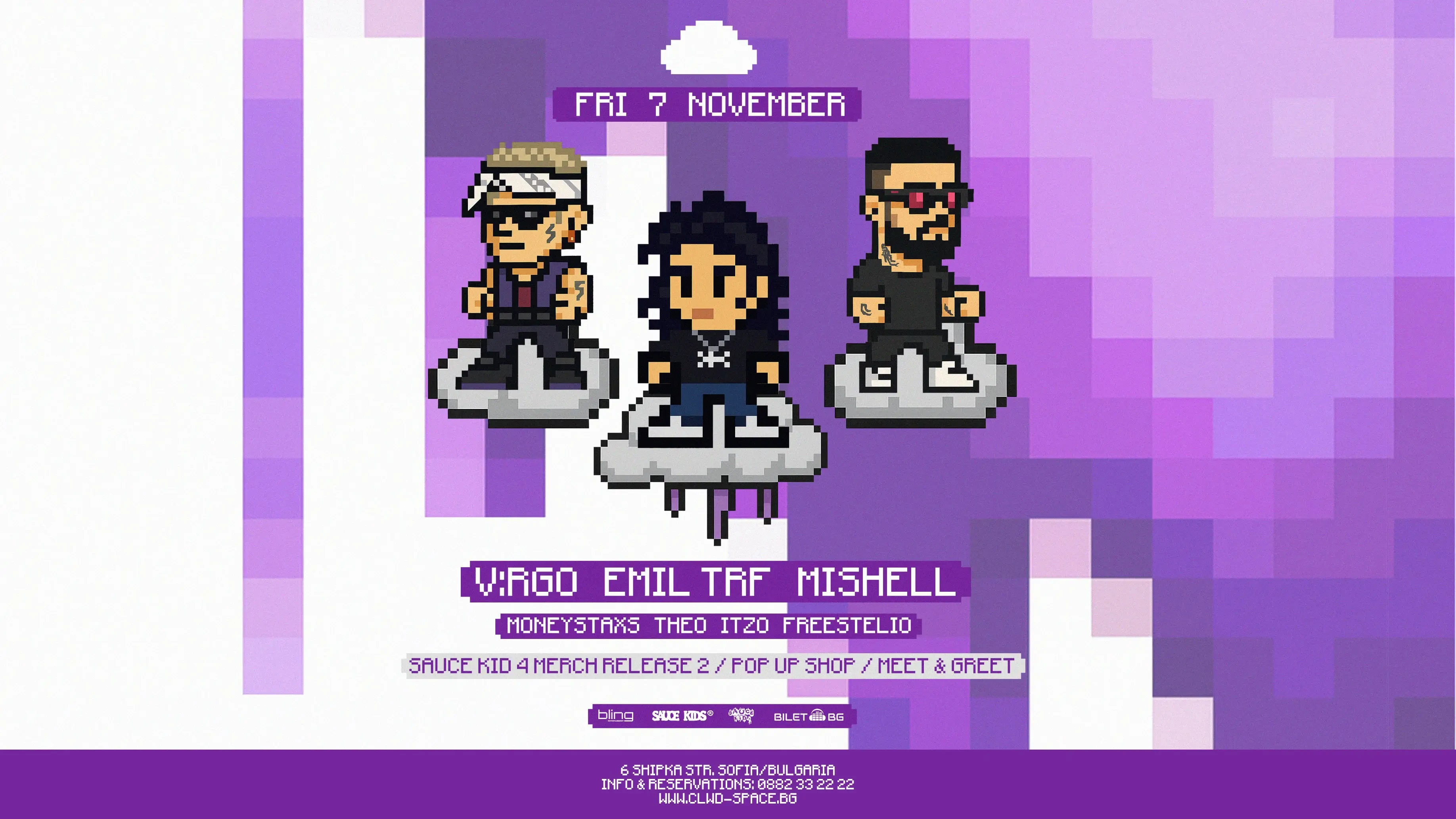 След буквално взривът, който се случи на центъра на София, когато V:RGO представи за първи път албума си пред хиляди души, идва времето да изпълни част от него за първи път на живо. Децата със соса изскачат в CLWD, комбинирайки EMIL TRF, MISHELL, MONEYSTAXS, THEO, ITZO, FREESTELIO, за да направят първото си участие на тази нова локация.