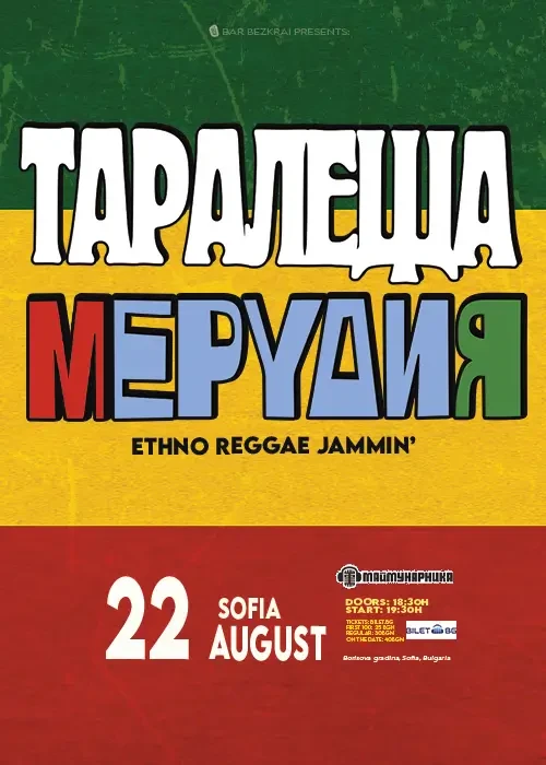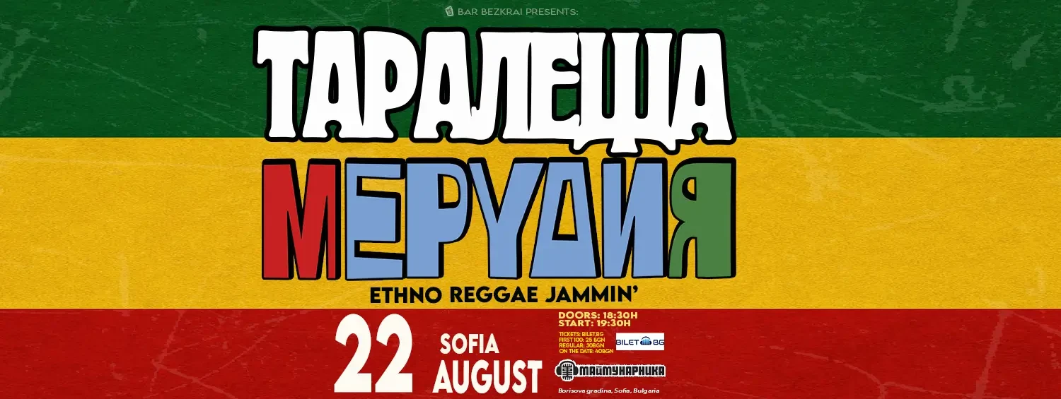Под гаснещото слънце на август и с достатъчно количество морски пясък събран между пръстите, Ви предлагаме една класическа българска рецепта за преглъщане края на лятото - “Таралеща с Мерудия” - един концерт на две банди съчетаващи автентичен Бг фолклор с ямайски такъв… вкусно… и ще замирише на печени чушки - ама наистина…