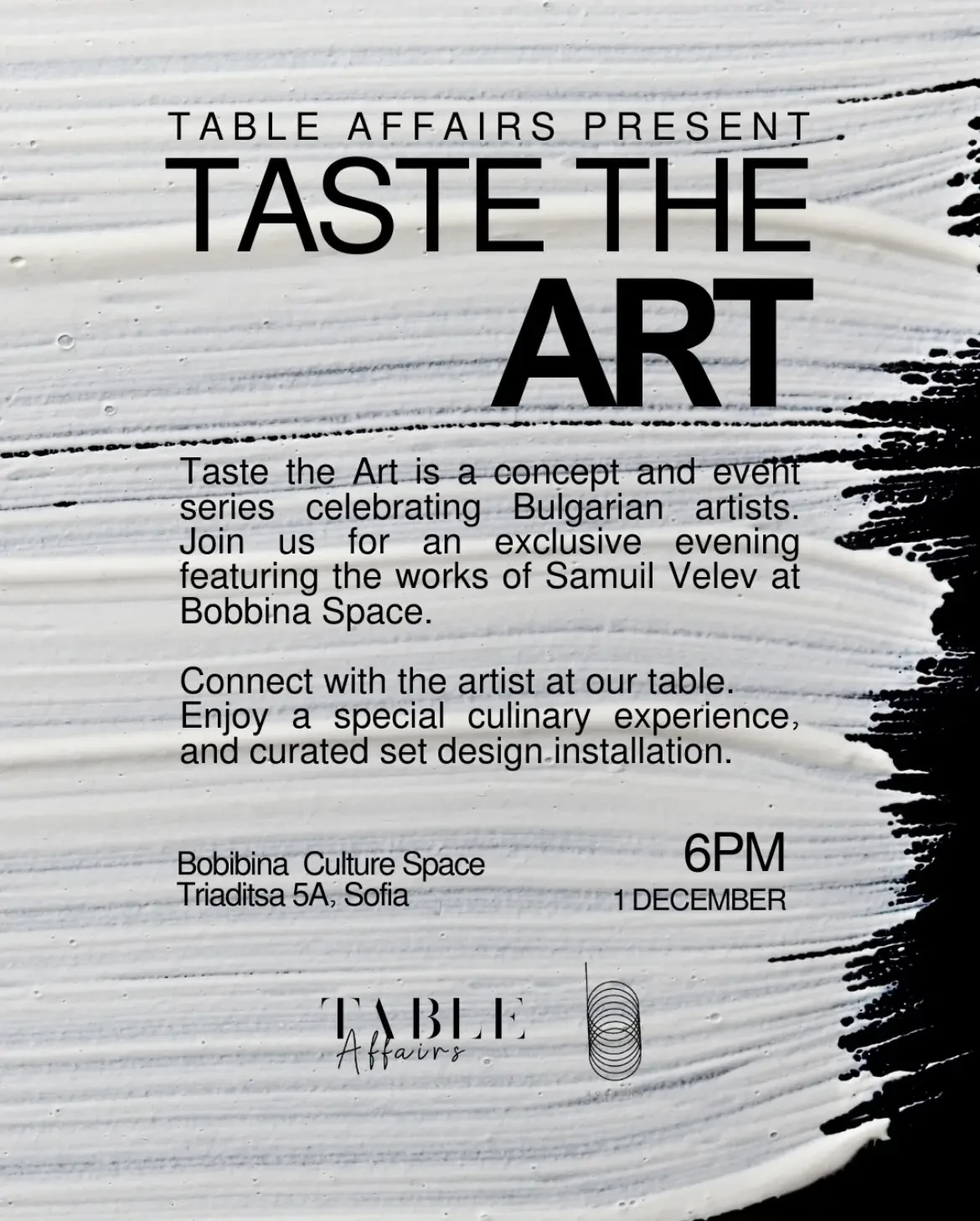 Taste the Art е концепция и серия от събития, които акцентират и подкрепят творчеството на местни артисти. Това издание ще представи впечатляващите творби на Самуил Велев, изложени във пространство Bobbina Space.