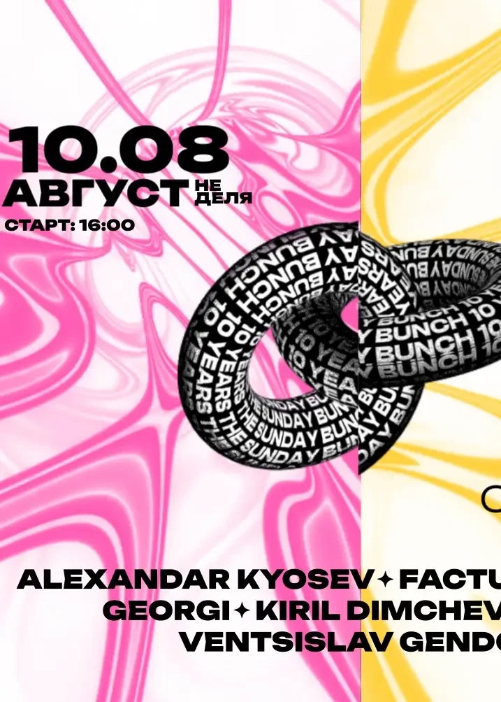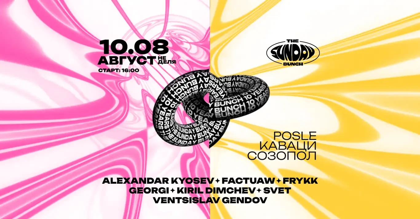 В средата на 11-тия ни сезон се местим към морето. Г(ореща) точка ще бъде бар POSLE на Каваци, Созопол, където ще продължим празнуването от десетата година на The Sunday Bunch с приятели и артисти - част от историята ни още от самото начало: Alexandar Kyosev, Factuaw, Svet, Frykk, Kiril Dimchev, Ventsislav Gendov и Georgi.