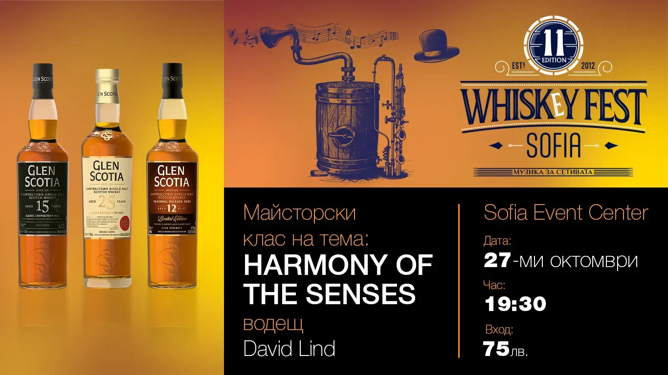 Само на този майсторски клас Дейвид Линд ще Ви докосне до магията наречена Glen Scotia. Ще може да опитате изключително рядкото 8 годишно издание Glen Scotia Scotch Around Limited Edition Single Cask, бутилирано в лимитираните 231 бутилки специално за България. Oсвен тази „тупалка“, ще имате възможността да се насладите и на 9 годишното издание излязло преди няколко месеца и бутилирано за тазгодишния фестивал в Кембълатун. Един от скъпоценните драмове е и 25 годишната Glen Scotia, оценена като уиски №1 за 2021 година.