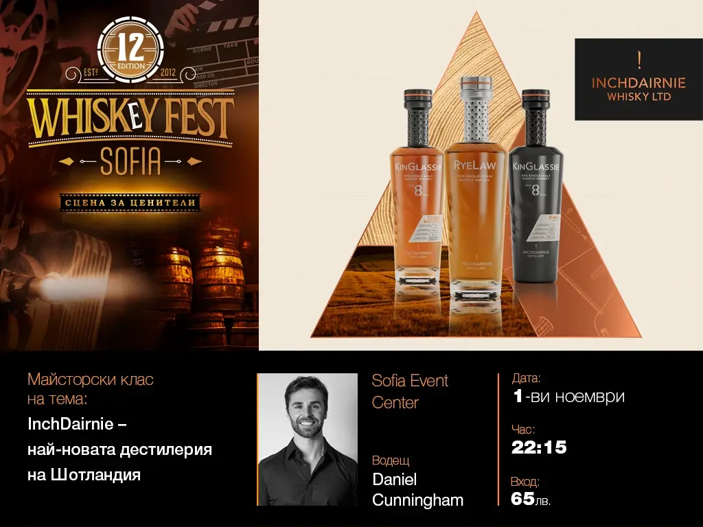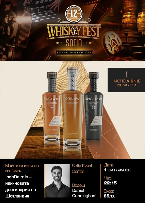 Гостите на мастъркласа ще имат възможност да се докоснат до най-новата дестилерия на Шотландия – InchDairnie. Тази година бяха произведени първите сингъл малцове на дестилерията под името KinGlassie. На класа а ще можете да опитате пет различни вида уиски х 20мл: