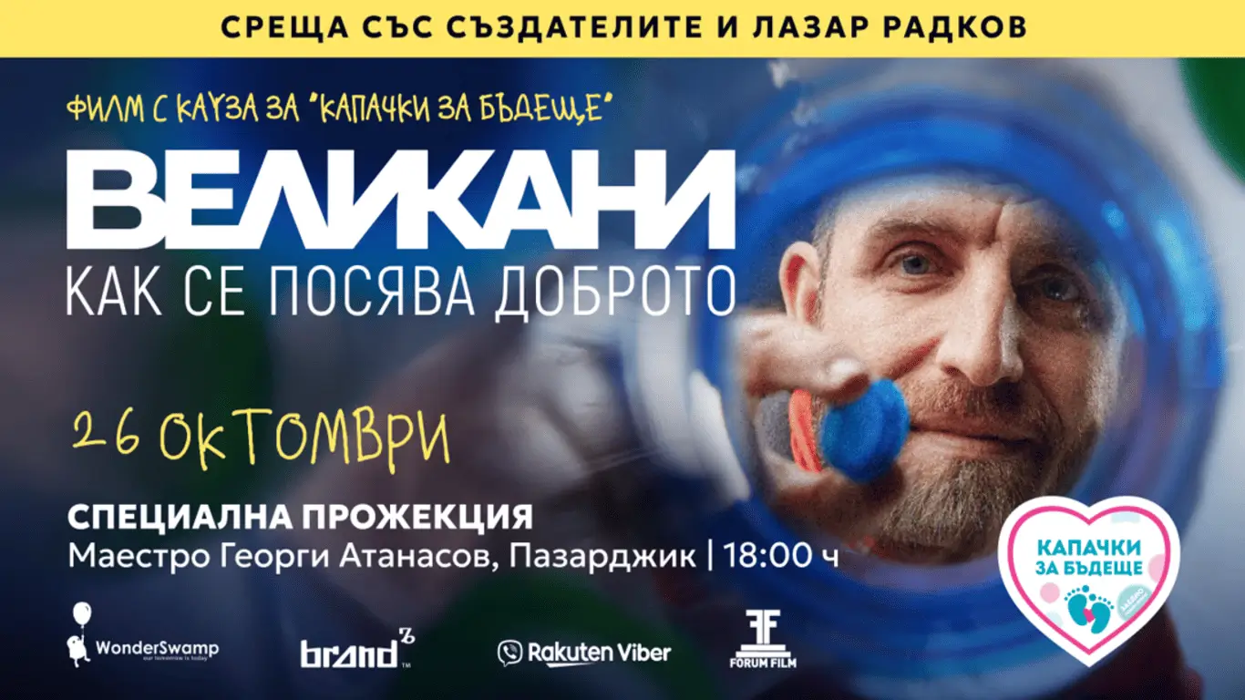 На 26-ти октомври 2025 г. публиката в гр. Пазарджик ще може да гледа „Великани" – пълнометражен документален филм за Лазар Радков и хилядите доброволци зад инициативата „Капачки за бъдеще".
