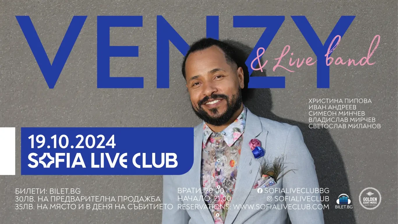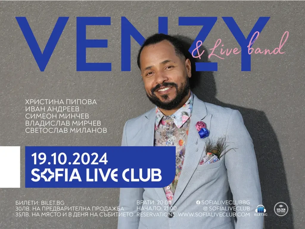 Заповядайте да се забавлявате и запознаете с VenZy от първо лице на 19 октомври в Sofia Live Club. Концертът започва в 21:00 часа. Отваряме врати в 20:00 часа.