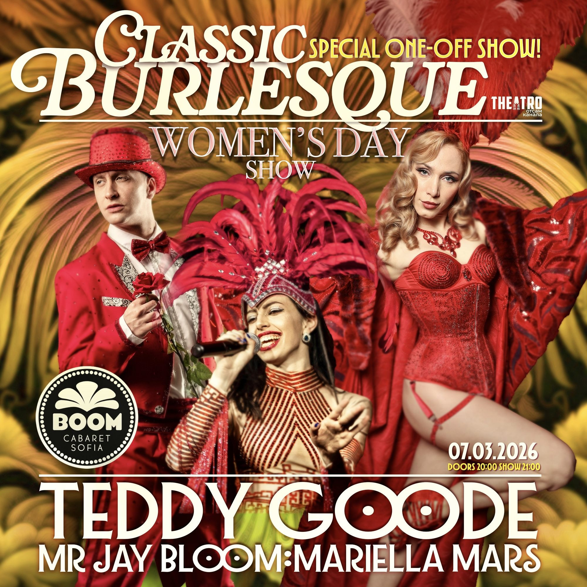 Специално за празника на жените създадохме едно бутиково бурлеск шоу! Класическо кабаре с певици и танцьори, което ще ви пренесе в епохата на Гетсби!