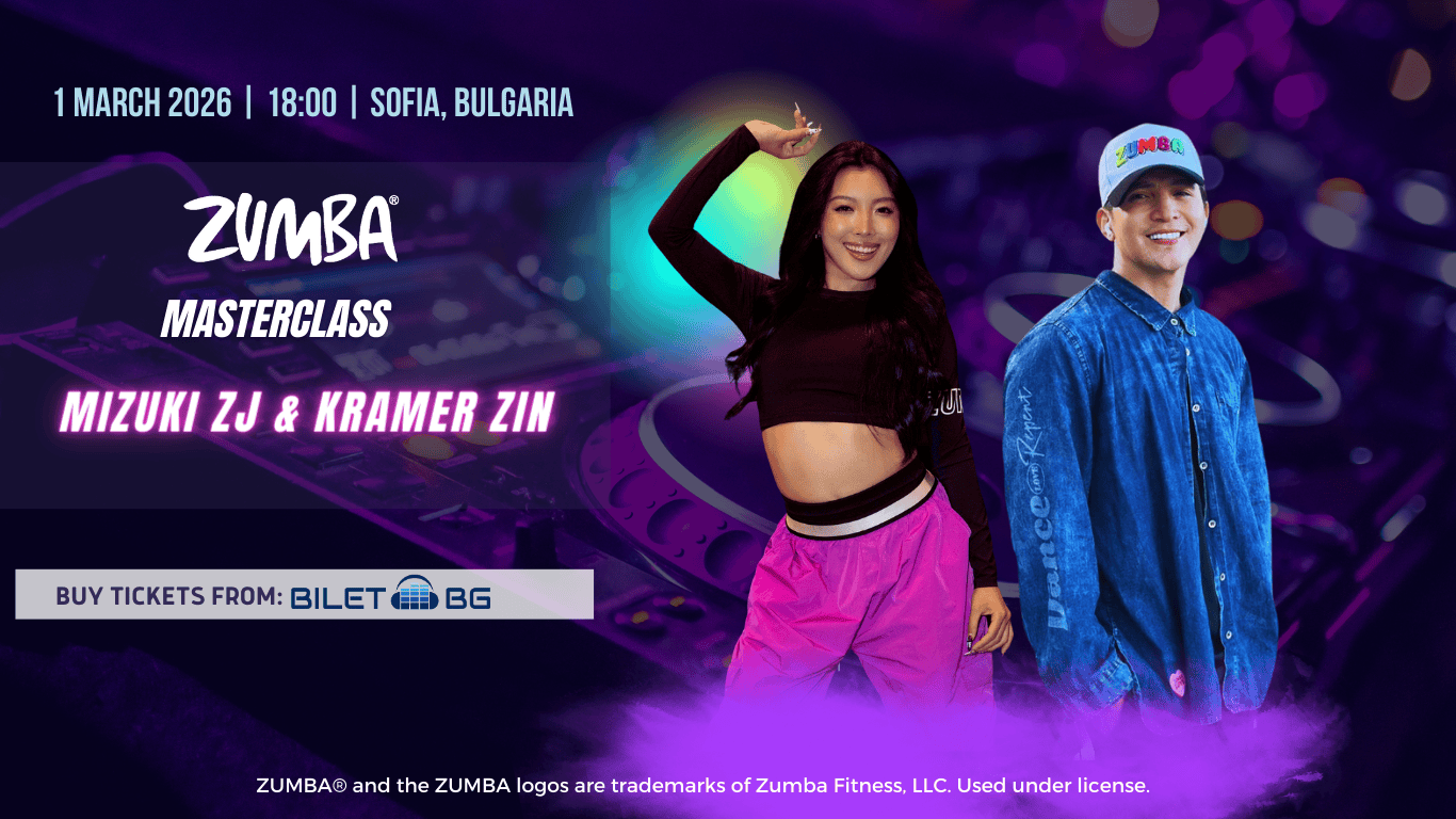 За първи път у нас пристигат световноизвестните Zumba® Jammer Mizuki и Kramer ZIN, които ще донесат своята експлозивна енергия, уникален стил и незабравими хореографии в един впечатляващ Masterclass!