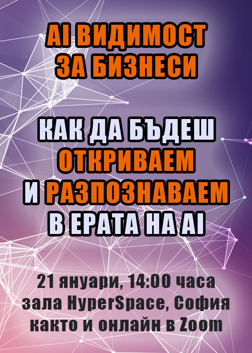 Ще получите Zoom линк по имейл Линкът за достъп до онлайн събитието ще бъде изпратен на Вашия имейл 1 час преди началото. Моля, проверявайте и папка „Спам“/„Промоции“.