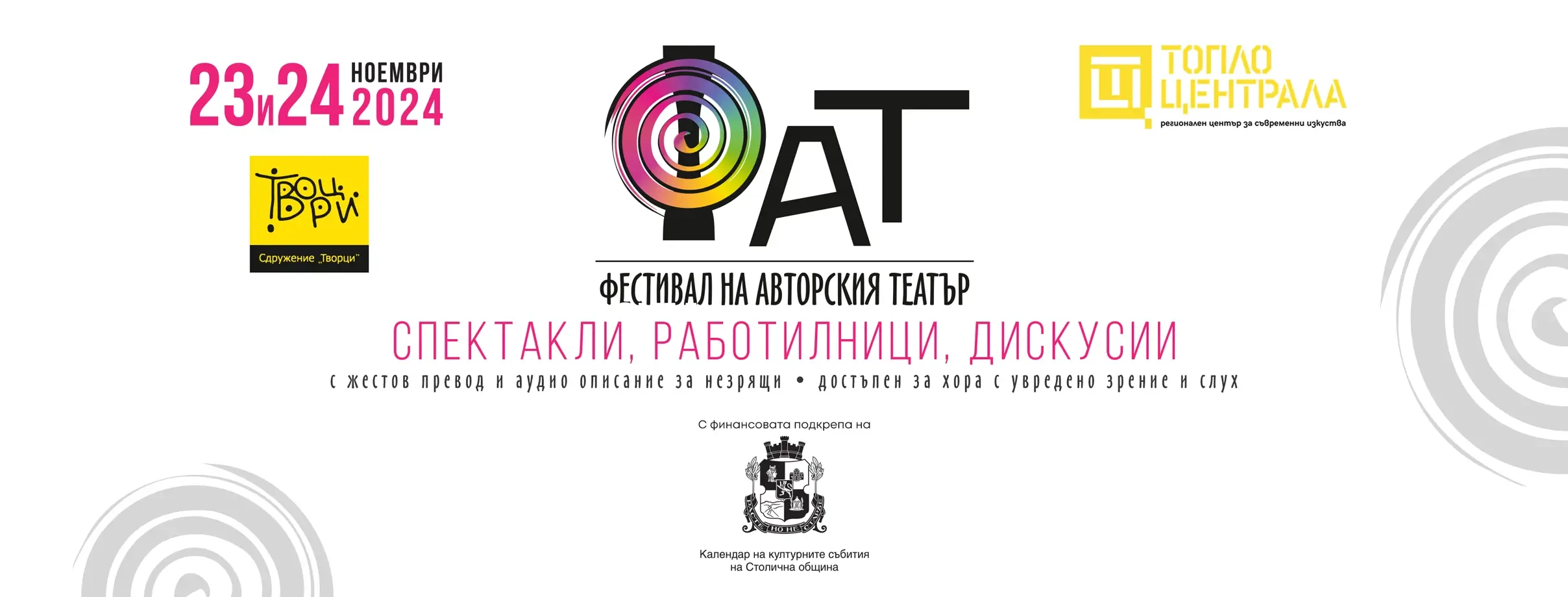 Петото издание на Фестивал на авторския театър - ФАТ 2024 ще се проведе на 23 и 24 ноември 2024 партньорство с РЦСИ "Топлоцентрала" и Столична община, част от Календара на културните събития на Столична община.