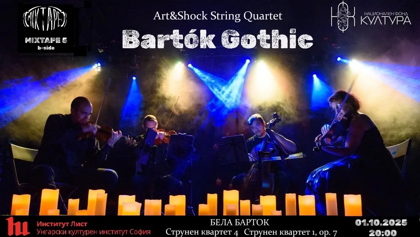 Проектът “BARTÓK GOTHIC” е посветен на мрачната красота на камерната музика за струнни инструменти на унгарския композитор Бела Барток в хорър, готик и драма киното вече над 60 години - от шестте струнни квартета до емблематичната Музика за струнни, ударни и челеста. BARTÓK GOTHIC Live представя тези ефектни творби на българската публика през призмата на готик културата и историята на киното. Струнните квартети на Бела Барток звучат в алтернативни пространства в изпълнение на Art&Shock String Quartet. Съставът обединява виртуозните млади музиканти Стоимен Пеев (цигулка), Ивайло Данаилов (цигулка), Стефания Янкова (виола) и Виктор Трайков (виолончело). В BARTÓK GOTHIC Live в София ще прозвучат Струнен квартет 1 ор. 7, Струнен квартет 4 и великолепната и безкрайно предизвикателна Соната за соло цигулка в изпълнение на младия Виктор Тренев - наш специален гост.