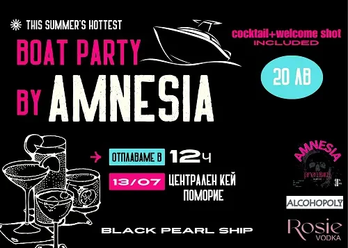 Първото издание на "Boat party by AMNESIA" е вече тук, в очакване на най-свежите хора! Наслади се на уникалната парти атмосфера с приятели, готина музика, коктейли приготвени с @Rosie.v0dka както и незабравимите шотове на @AMNESIAshot , които комбинирани с предизвикателствата на @ALCOHOPOLY вдигат яко градуса на партито🔥ще има и щипка адреналин, за любителите на водните забавления🤫 'А ако искаш да играеш на сигурно можеш да закупиш своя билет от @Biletbg или директно като пишеш на нашия профил в инстаграм.