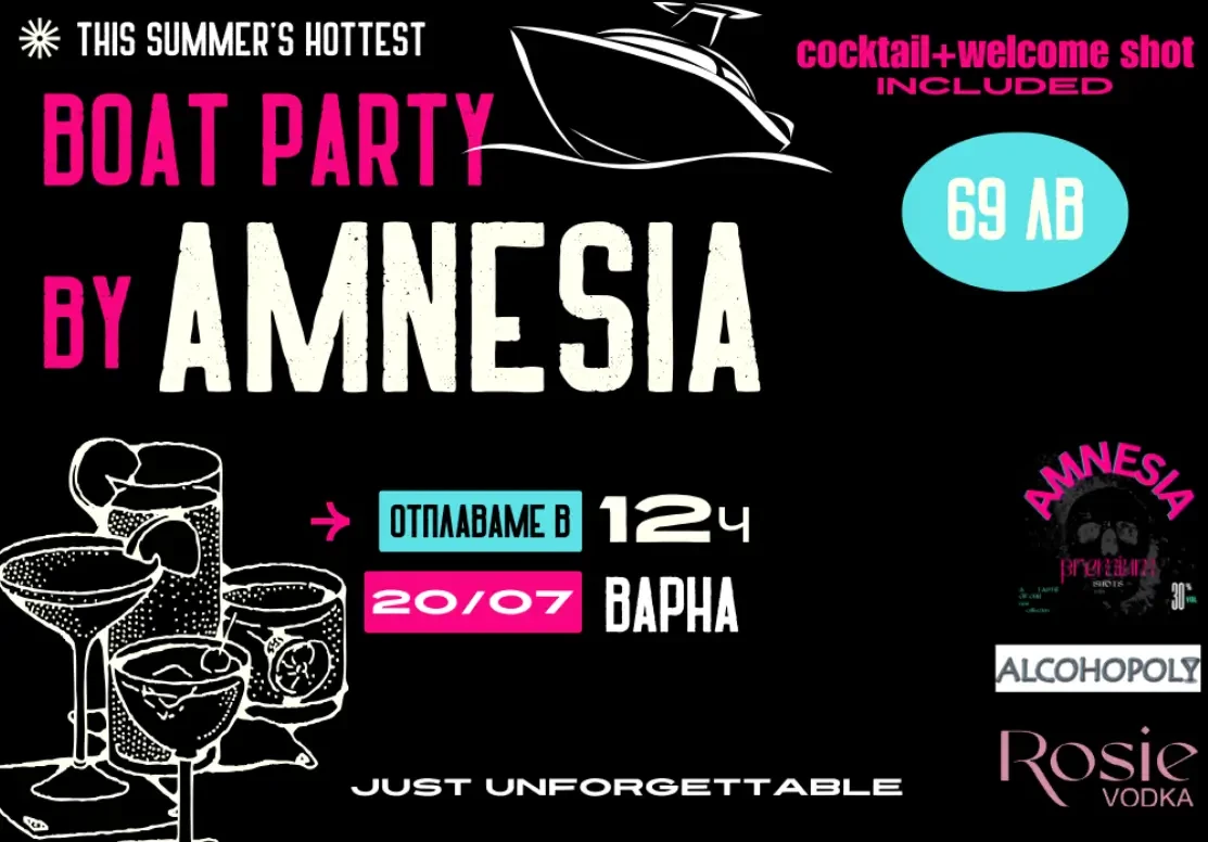 ☀️Готови ли сте за едно от най-горещите партита това лято? На 20.07 във Варна 🌊ще се проведе второто издание на Boat party by AMNESIA.🍸 Нека покажем как се прави в морската столица с топ парти атмосфера! Погрижили сме се за цялостното настроение с коктейли приготвени с @Rosie.v0dka , както и незабравимите шотове на @AMNESIAshot , който комбинирани с предизвикателствата на @ALCOHOPOLY вдигат яко градуса на партито🔥 А за музиката не се тревожи, в добри ръце си, RAP/ TRAP/ HOUSE/ R&B, че и малко гръцко за разкош🏖️ Не му мисли, направо се мятай!🤟🏽 купи на билет.бг 🎟️ #амнезия #парти #amnesia #boatpartybyamnesia #билет #реклама #ad #amnesiashots #vodkarosie #boatparty #партилодка #гивауей #varna #варна #лятнопарти #черноморе #лято #summer #2024 #bulgaria #българия #amnesiashots #shots #liquor