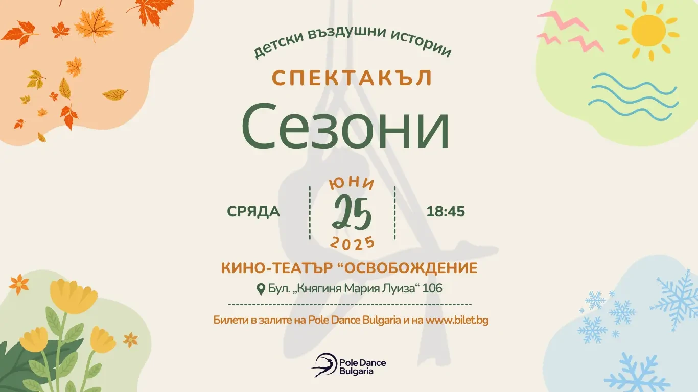 Билетите за "Детски въздушни истории" в Кино-Театър "Освобождение" на 25 юни 2025 г. са в продажба в мрежата на Bilet.bg, както и в залите на Пол Денс България на цени от: