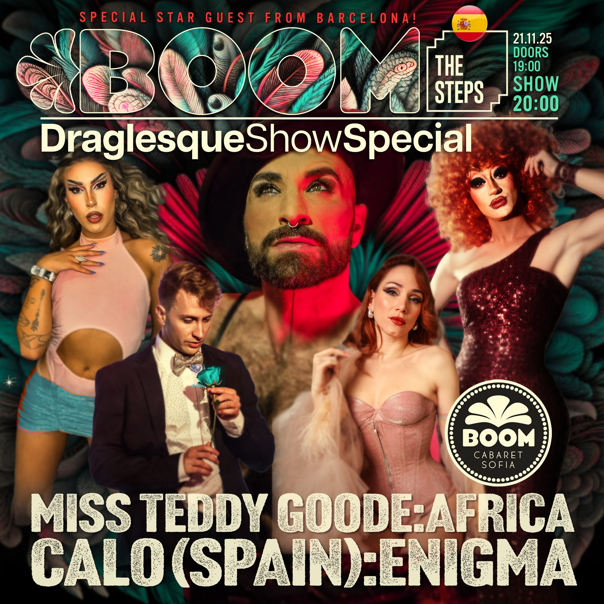 Together with him on stage you will see the dancers of “Boom Cabaret”, as well as the wild queens Africa and Enigma!