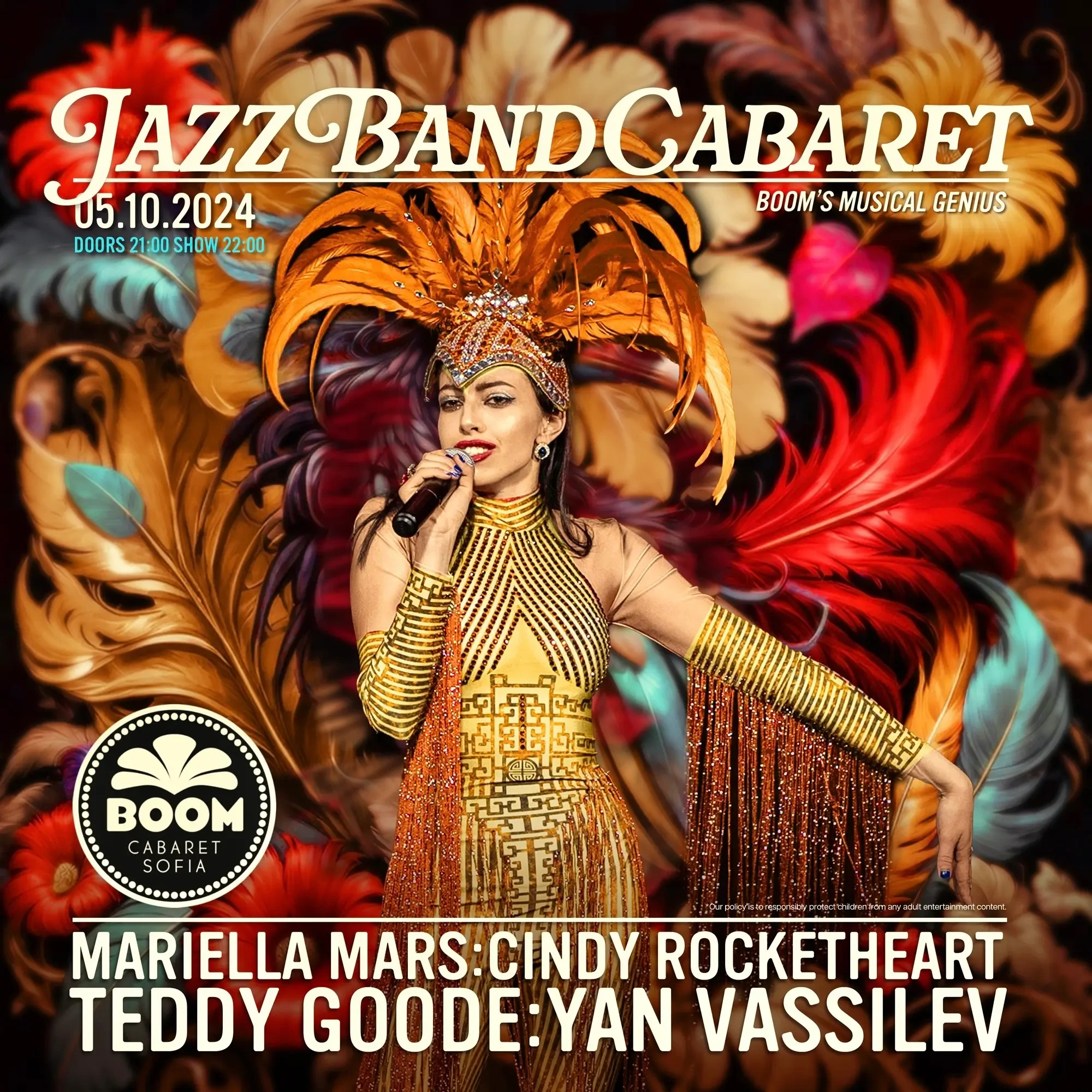 Кабаре спектакъл под съпровода на жива джаз банда! Невероятно кабаре изживяване, което ще ви пренесе в друго време! Истинска магия на сцената ви очаква с красивите гласове на “Буум Кабаре” и жива джаз музика. Ще гледате страхотни танцьори и певици, класна еротика, бляскави костюми, бурлеск и комедия в шоу на световно ниво.