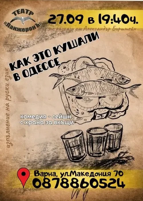 — Ойц, а шо вие знаете за Одеса, а? — Град, в който всяка история е овкусена с хумор, а всяко ястие — с лъжица любов! В спектакъла „Как са яли в Одеса“ ви очаква истинско гастрономическо щастие: забавни истории, смях, колоритни персонажи… и всичко това може да опитате на вкус!