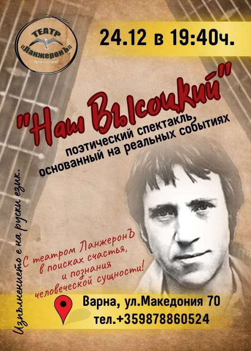 Нашият Висоцки! В многообразието от образи и сюжети на поета всеки човек има своя собствен Висоцки. Така и театър „ЛанжеронЪ“ предлага на вашето внимание своя Висоцки. Володя, който често е идвал в Одеса, когото продължават да обичат, слушат и четат почти във всеки одески двор. Човек на рядка смелост и трезво отношение към битието. С особено изострено чувство за отговорност пред истината и непримиримост към безразличието и лицемерието. Висоцки беше и остава един от онези поети, които ни помагат да разпознаем в вътрешния мрак на користта, двуличието и лъжата нашето истинско лице. А онази притегателна сила на поета, която усещаме в неговите стихове, извира от любовта му към хората.