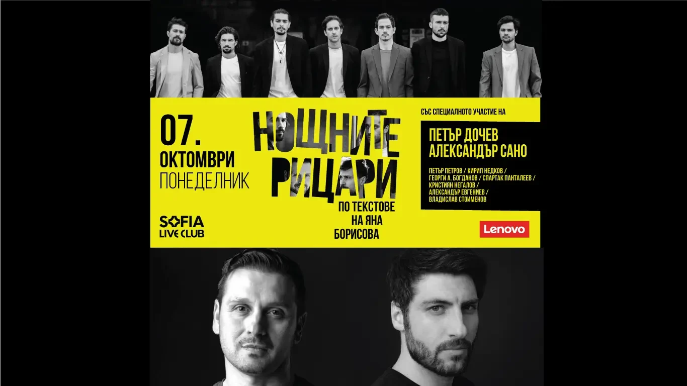 На 7 октомври към Нощните Рицари ще се присъединят и изключителните актьори Александър Сано и Петър Дочев – още два гласа, които ще разцепят нощта, под звуците на невероятна музика на маестро Милен Кукошаров.