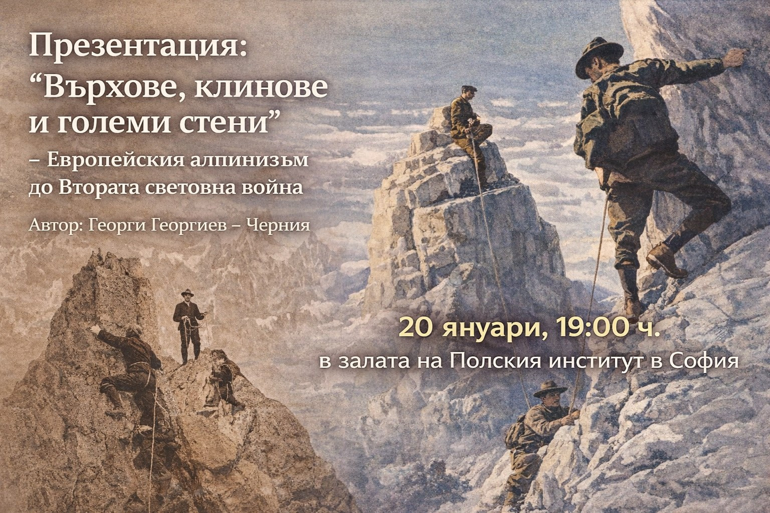 On January 20 at 7:00 p.m. in the hall of the Polish Institute we will present you the extremely interesting presentation of Georgi Georgiev – Cherniya – Presentation: "Peaks, Wedges and Big Walls" - European Mountaineering until the beginning of World War II.