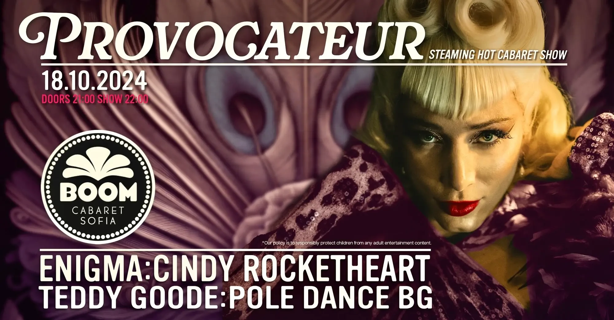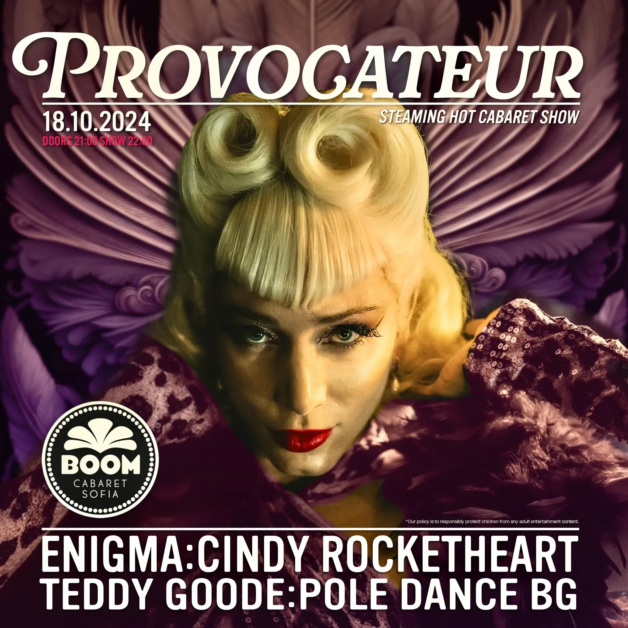 Едно магично, провокативно и зрелищно шоу, в което акробати, певици, бурлеск диви и танцьори ще завладеят сцената с нови изпълнения. Водеща ще бъде, комедийната актриса Теодора Гууд, която ще облече нощта в смях.