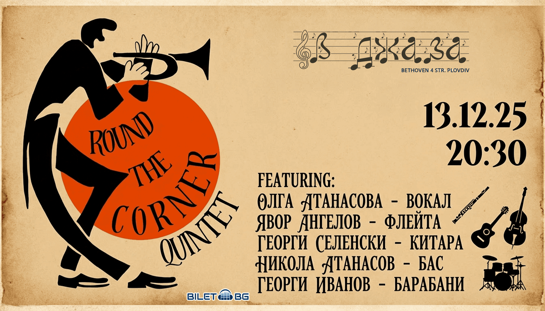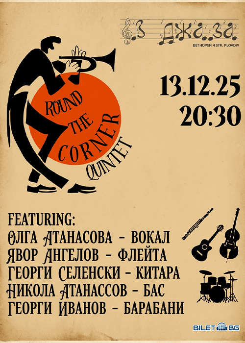 ‘Round the Corner Quintet ще ви поведе през емблематични песни от златната ера на джаза – с фин поклон към великата Ella Fitzgerald, преплетени с нежното и характерно звучене на флейта.