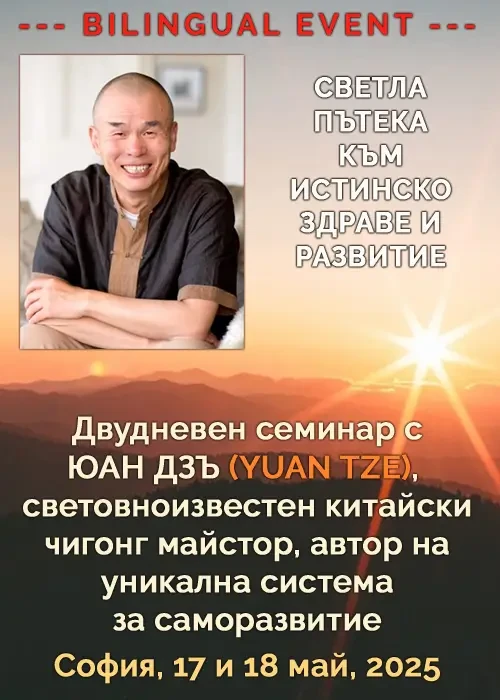 We are extremely honored that Yuan Tze, a world-renowned teacher and author, is offering a workshop in Bulgaria for the first time. This 2-day workshop is suitable for anyone seeking a clear and bright path leading to good health, true happiness, and growth. Yuan Tze will shed light on how to achieve these goals, as well as how to overcome obstacles along the way.